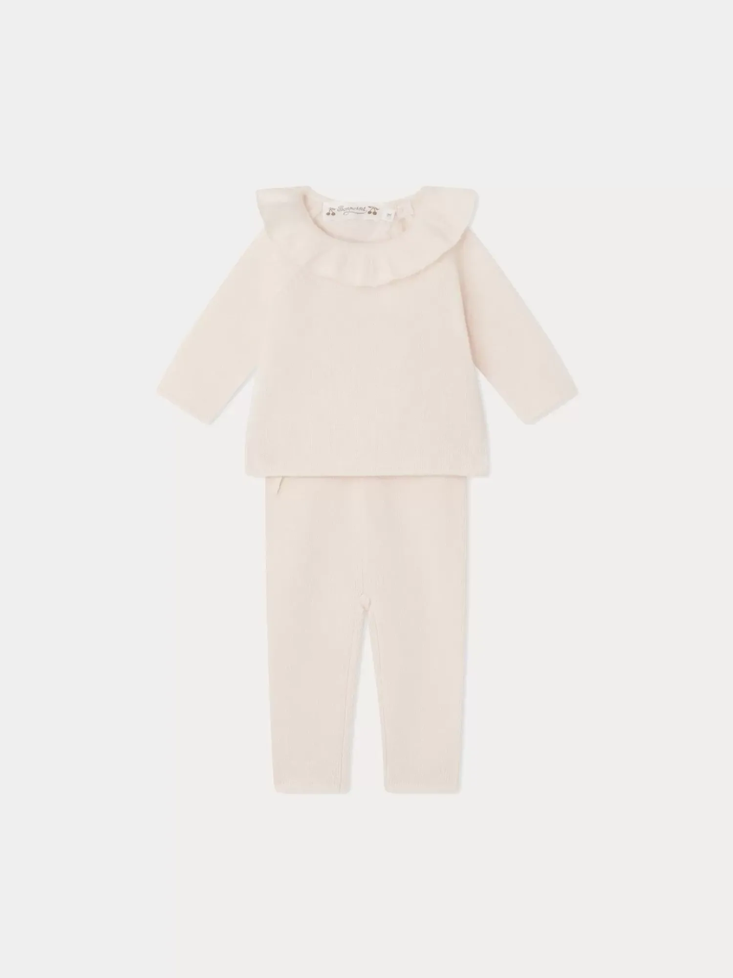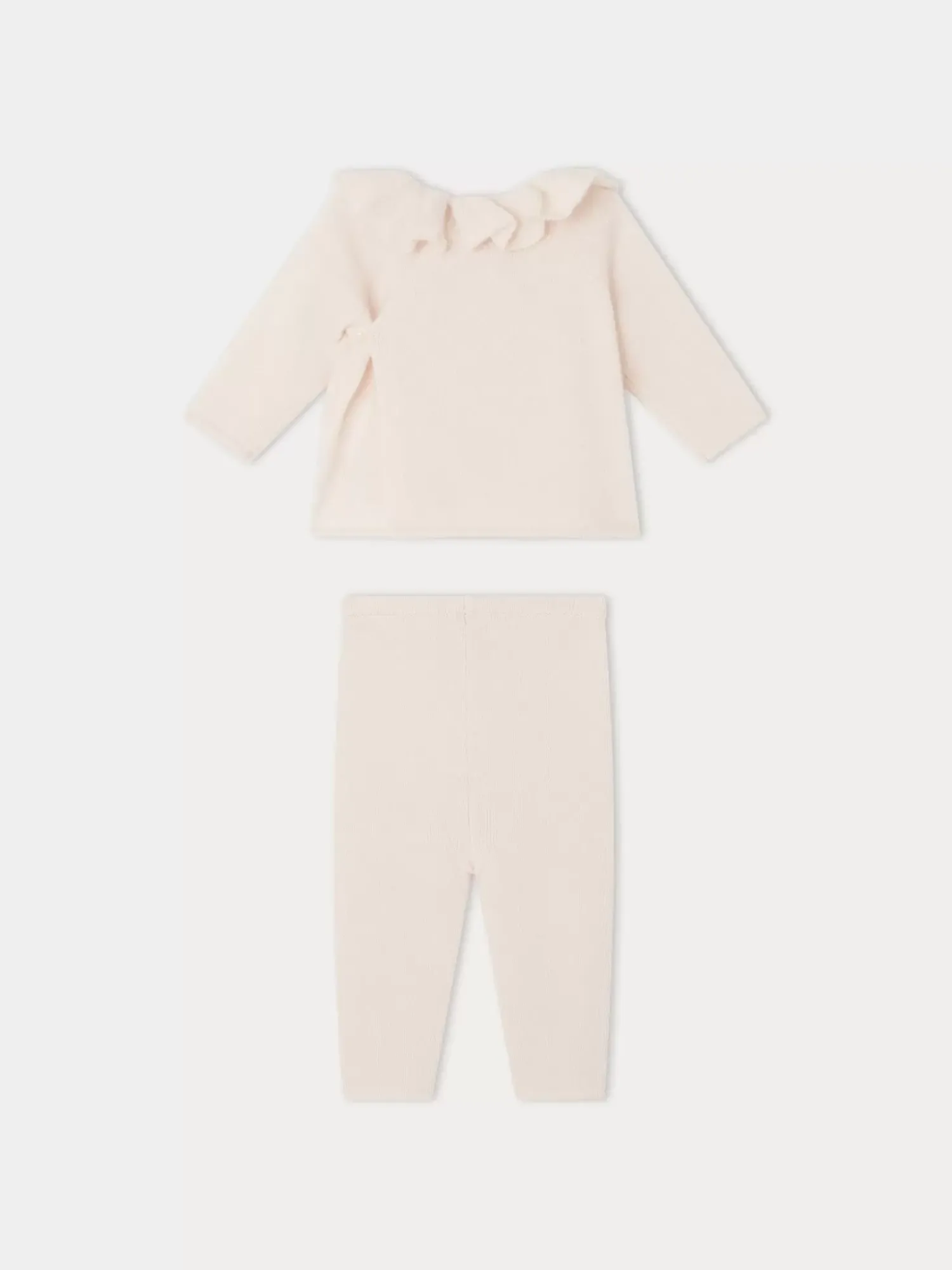 This Anisa Babies’ Set Is Made Of Single-Color Material With A Charming Ruffle At The Neckline And A Wrap Front That Ties At The Back. It Is Knitted From Cashmere.