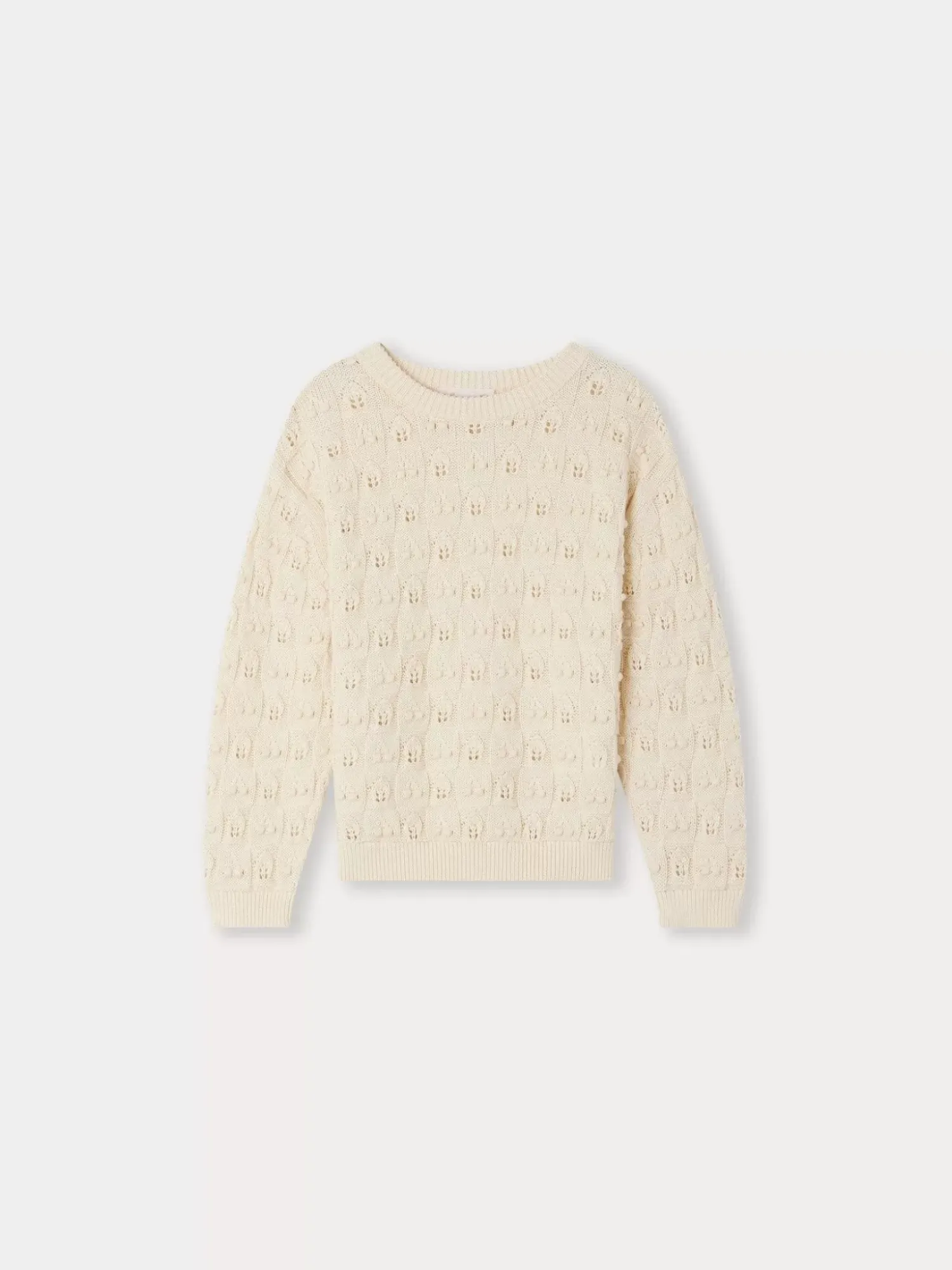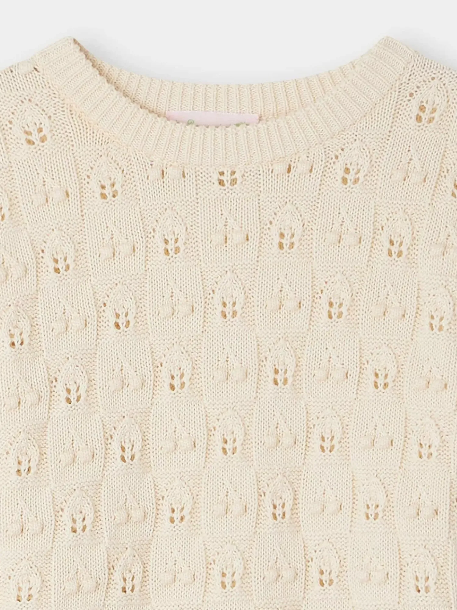 This Knitted Anumati Sweater For Girls Is Made Entirely From Organic Cotton. It Features Textured Cherries And Openwork Corn Cobs For Additional Charm.