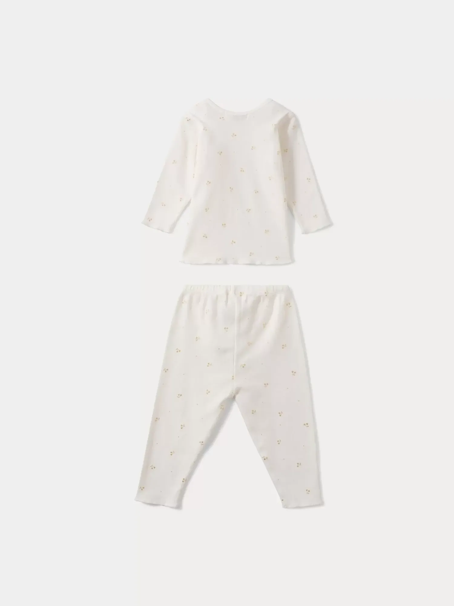 This Babies’ Two-Piece Pajama Set Will Keep Your Little One Stylish Day And Night. The Long-Sleeved Top And Pants With An Elasticated Waistband Are Both Made From White Cotton Material Decorated With Little Golden Cherries, For A Poetic Look.