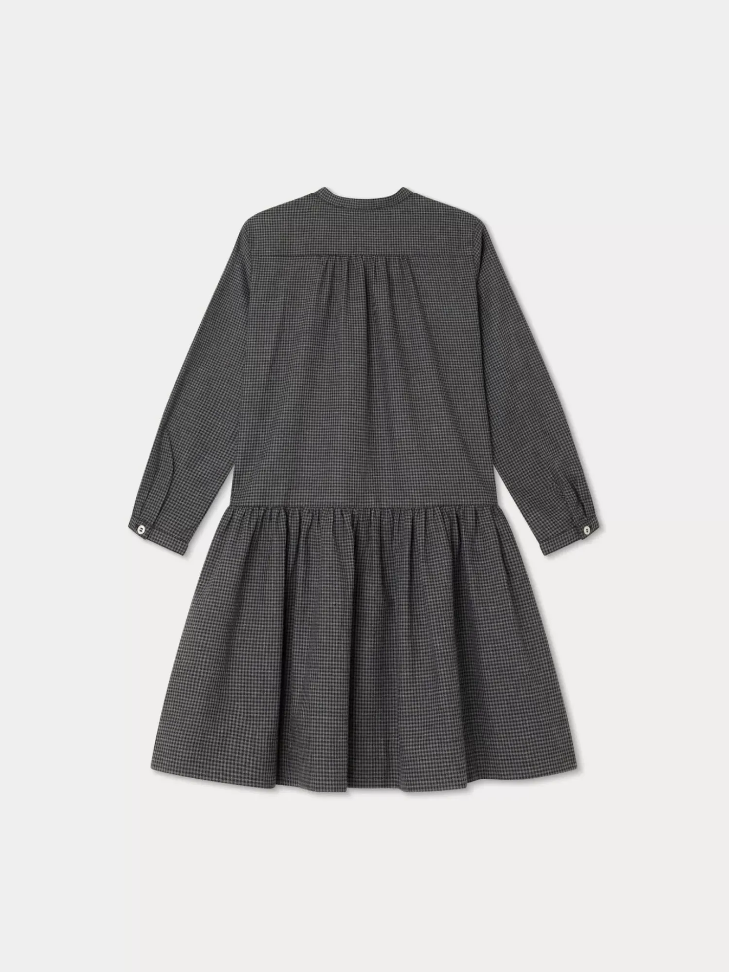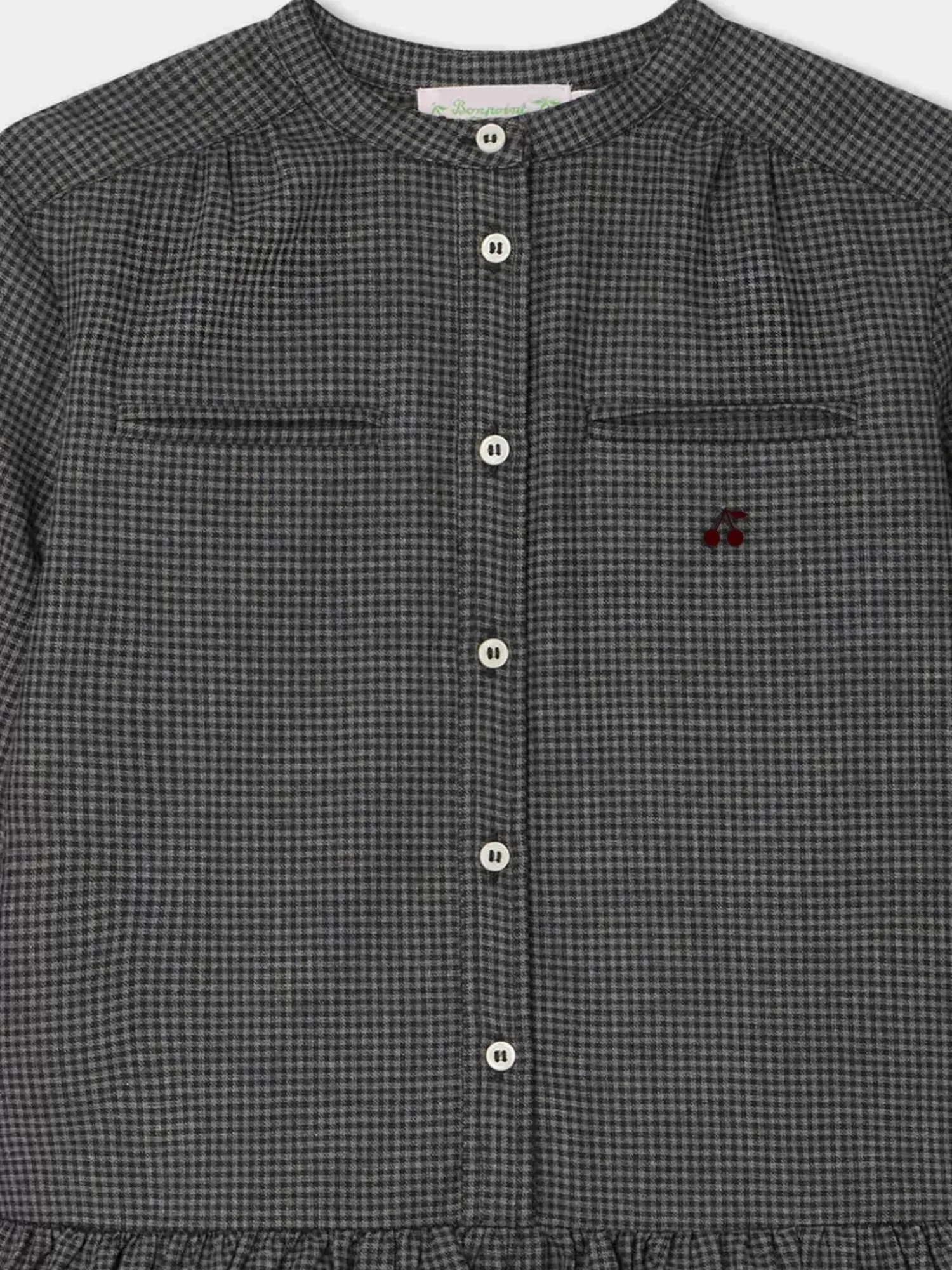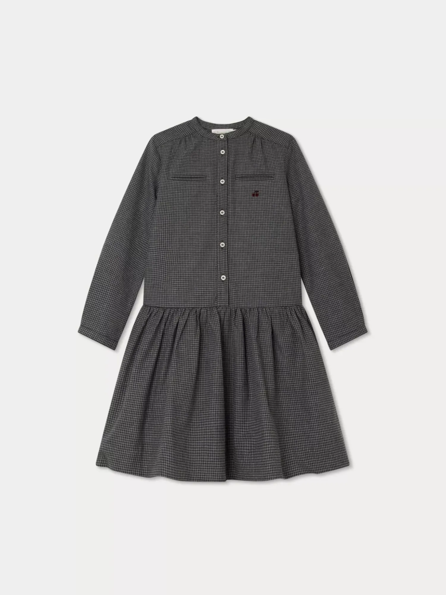 This Long-Sleeved, Printed, Crew Neck Becky Dress For Girls Combines A Top With Buttons And A Gathered Skirt. An Embroidered Cherry Enhances One Of The Faux Piped Pockets On The Chest.