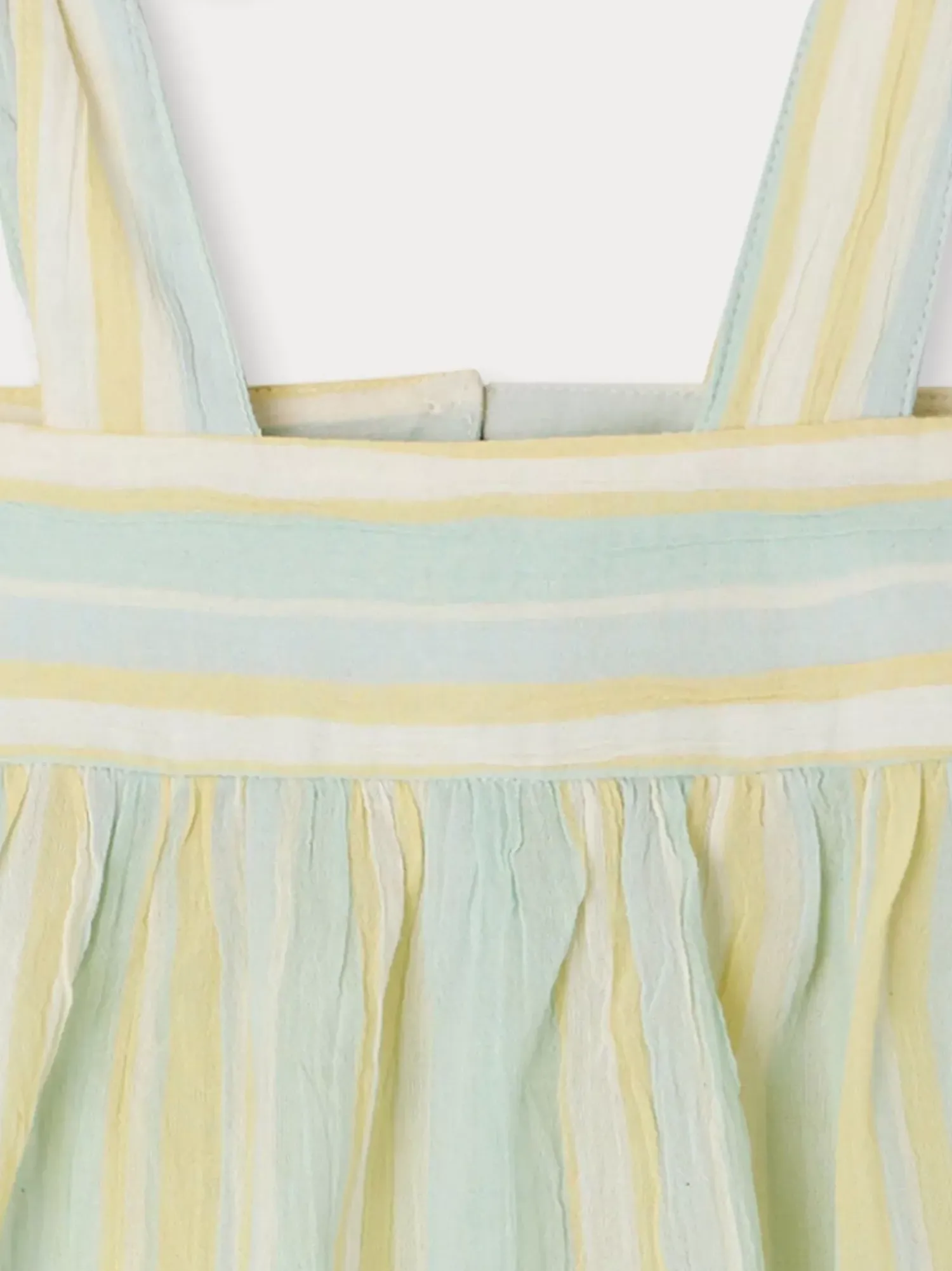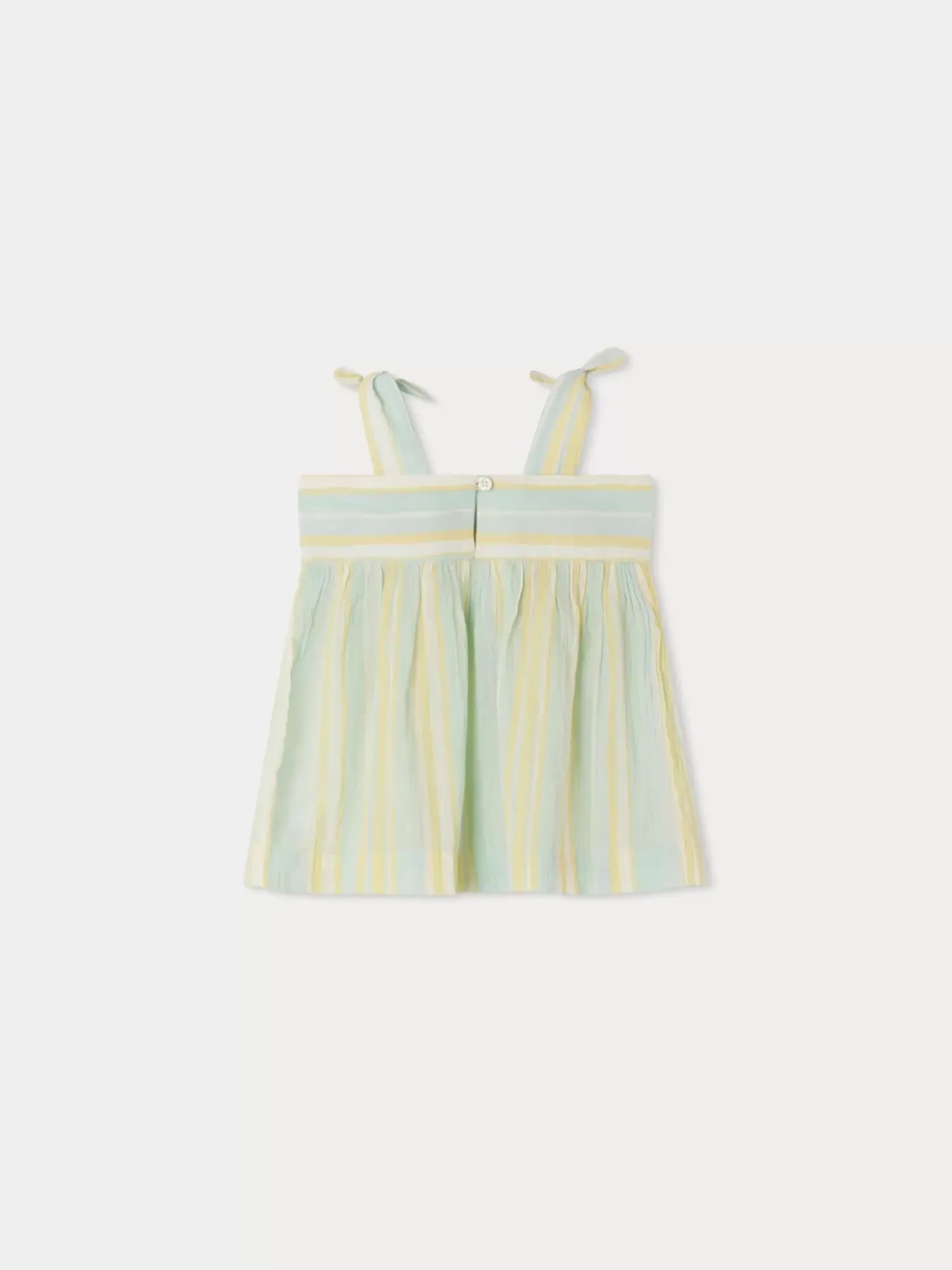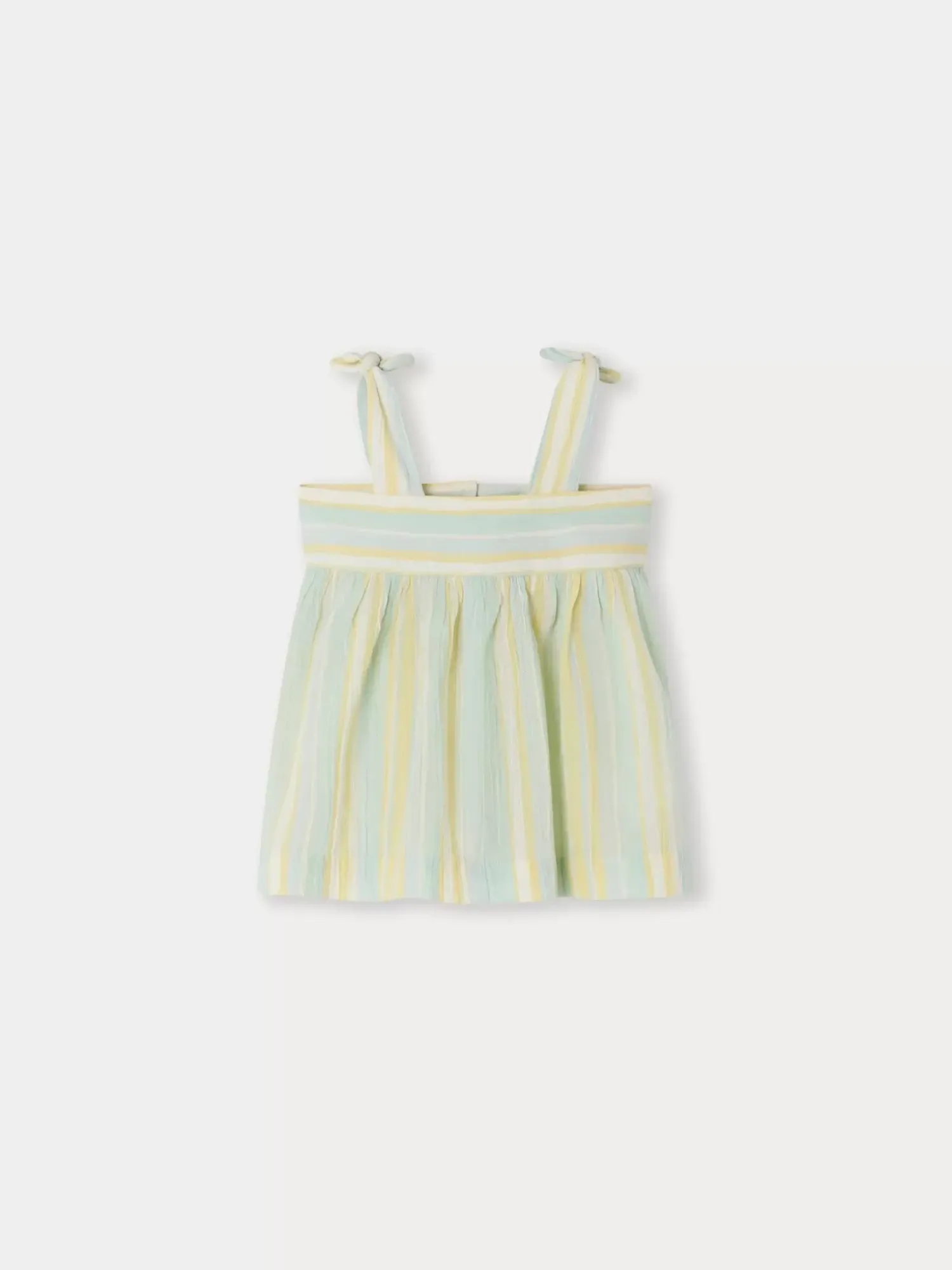 La Blouse Andresia Pour Bébé Se Distingue Par Ses Rayures Aux Teintes Tendres. Deux Larges Bretelles Assorties Se Nouent Délicatement Au Niveau Des Épaules.