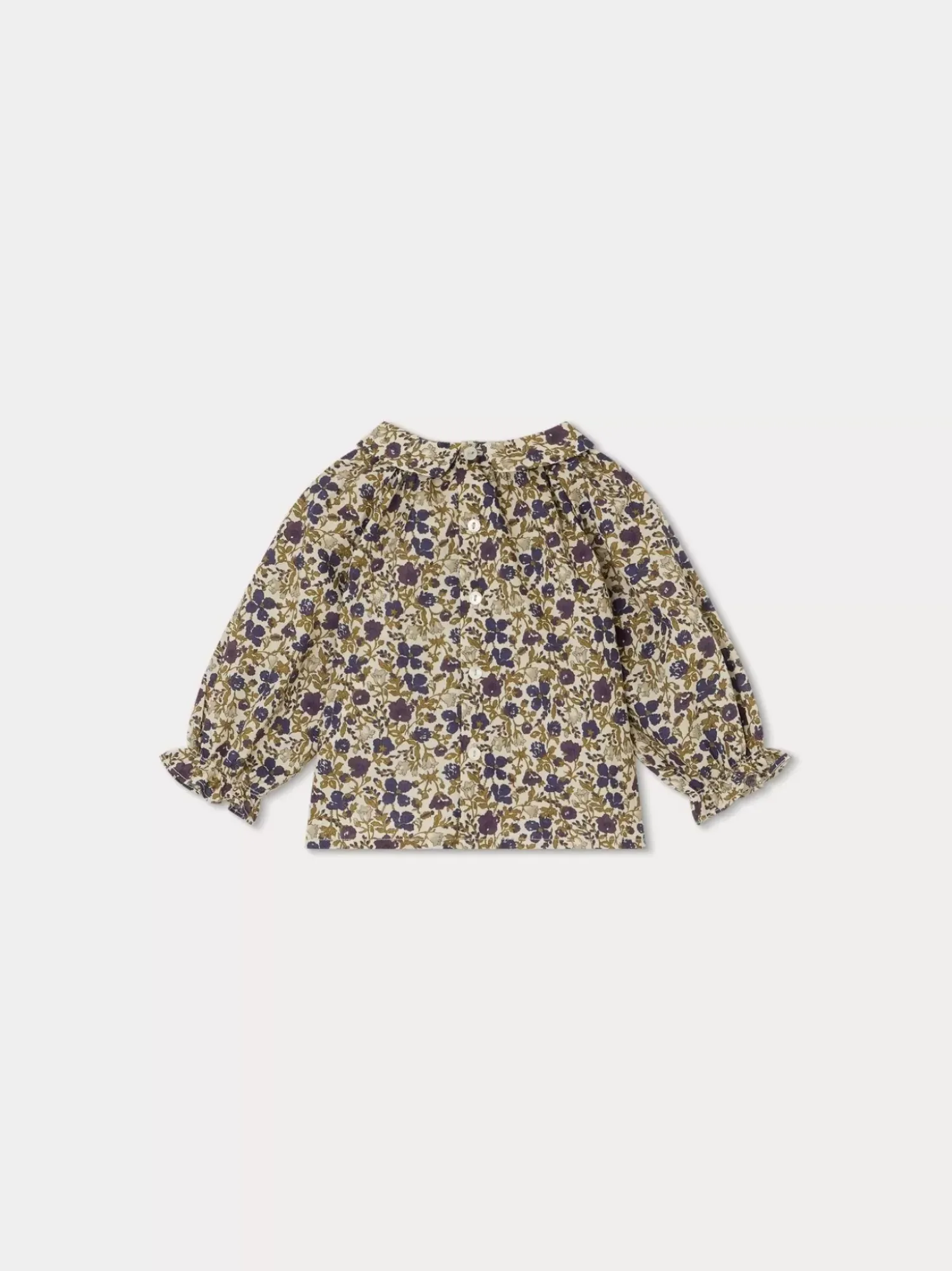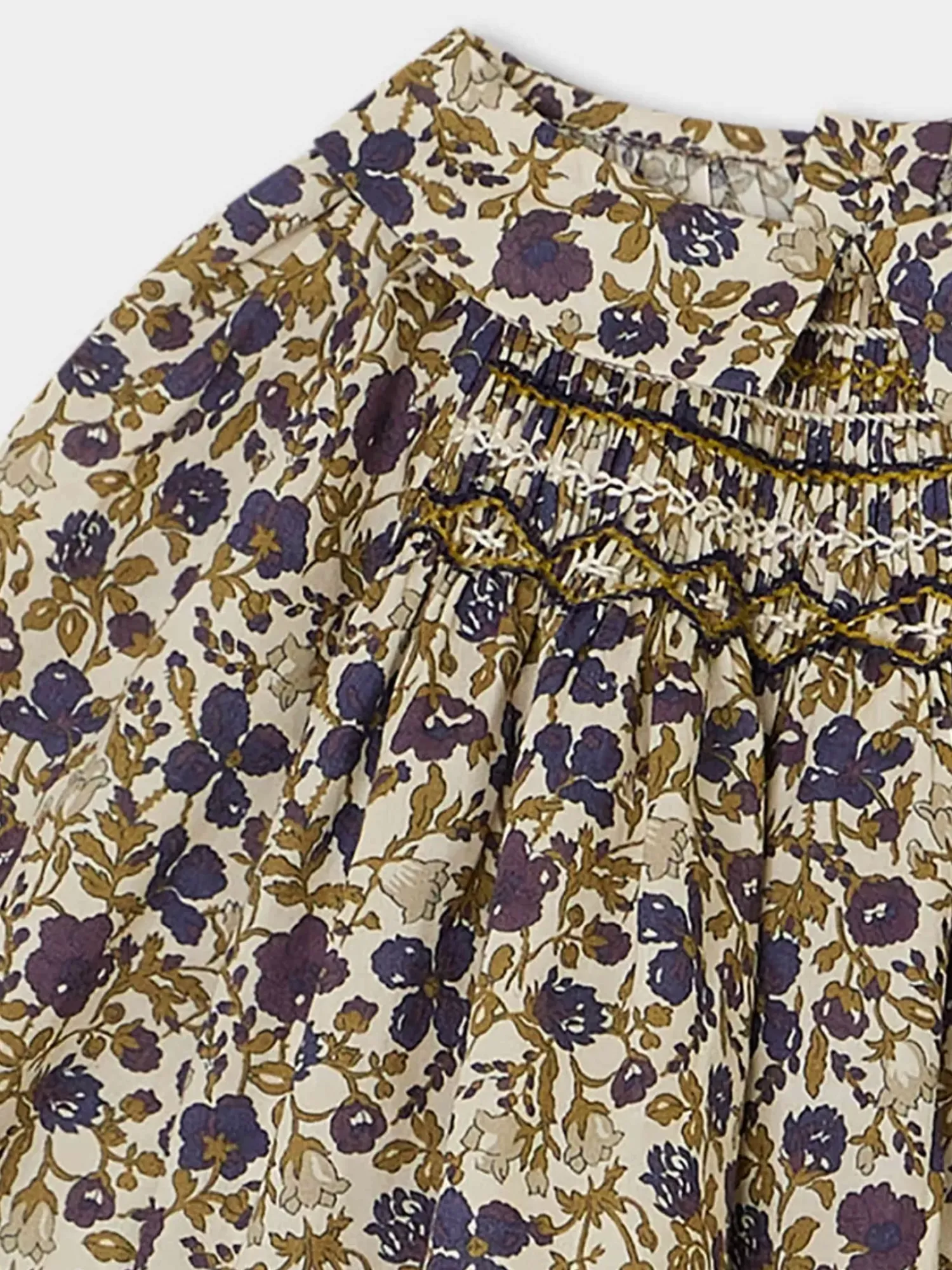 Cette Blouse À Manches Longues Pompon Pour Bébé S’Habille D’Un Tissu Liberty Floral. Sa Coupe Ample Est Rehaussée D’Un Col Plat Et De Smocks Brodés Assortis À L’Imprimé.