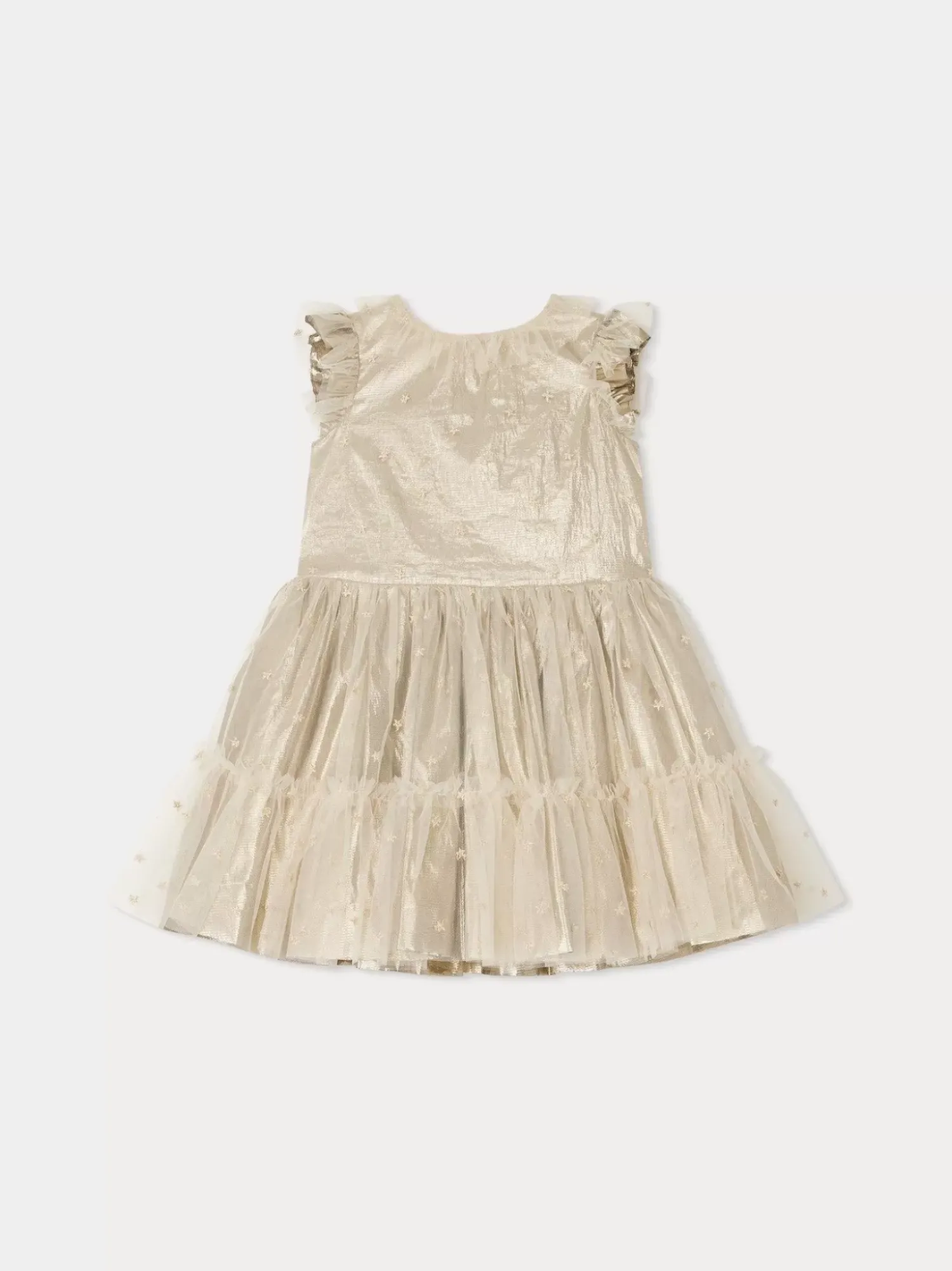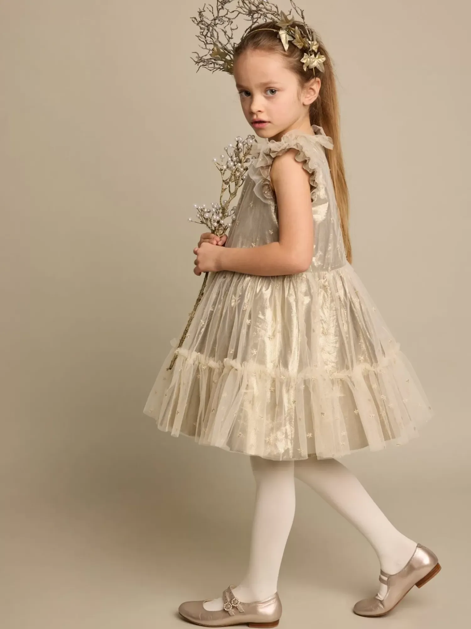 Ideal For Special Occasions, This Bonheur Dress For Girls Is Made From A Lamé Fabric That Gives It Plenty Of Charm. This Short-Sleeved Design Has A Tulle Overlay With Delicately Embroidered Stars.