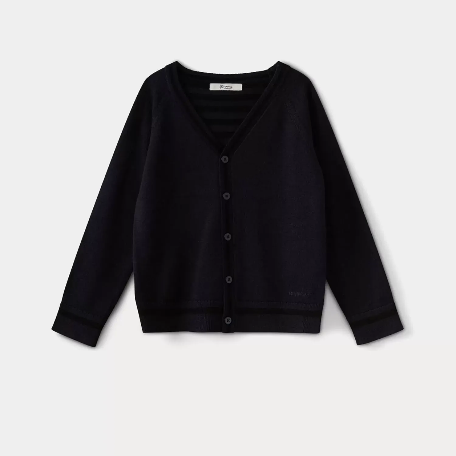 This Boys’ Cardigan Features A Dynamic Style With Its Striped Trim And Interior. The Hem Features A Tone-On-Tone Bonpoint Logo.