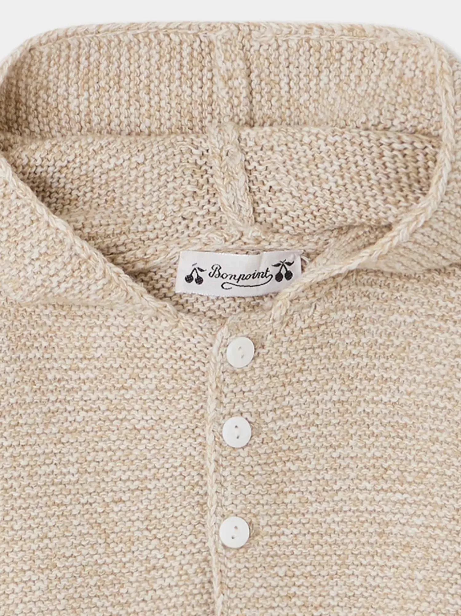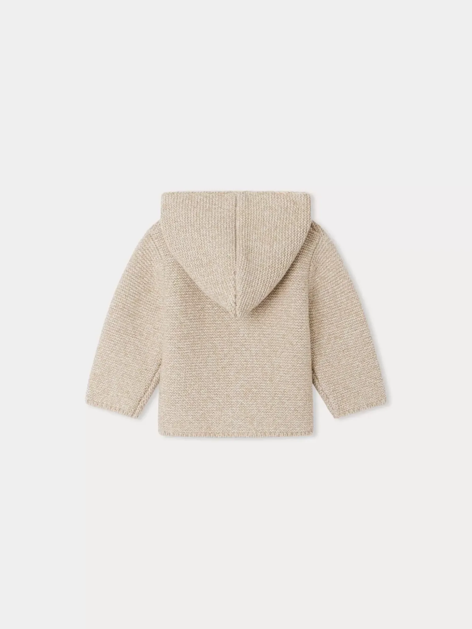 Ce Burnou À Capuche Atexane Pour Bébé, Conçu En En Laine Et Coton Mélangé, Se Ferme Grâce À Trois Délicats Boutons Nacrés. Sa Conception En Tricot Point Mousse Élastique Le Rend Facile À Enfiler. La Laine Utilisée Est Certifiée, Garantissant Le Bien-Être Animal.