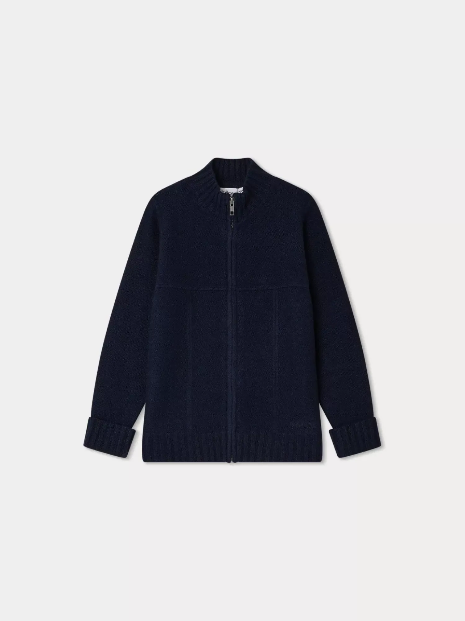En Cachemire Uni, Ce Cardigan Zippé Pour Garçon Est Structuré Par Des Empiècements Avec Coutures En Relief. Ce Modèle Intemporel Se Dote D’Un Col Montant Côtelé Et De Revers Aux Poignets.