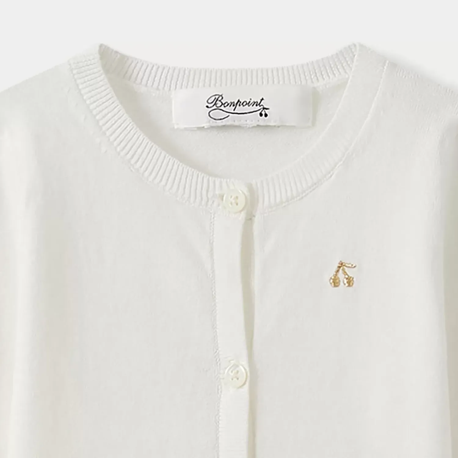 This White Cotton Cardigan Brings A Touch Of Light To Dark-Colored Outfits. It Is Decorated With Pretty Little Pearly Buttons And A Golden Cherry Embroidered On The Front. Pair It Up With A Taffeta Dress For A Graceful Ensemble.