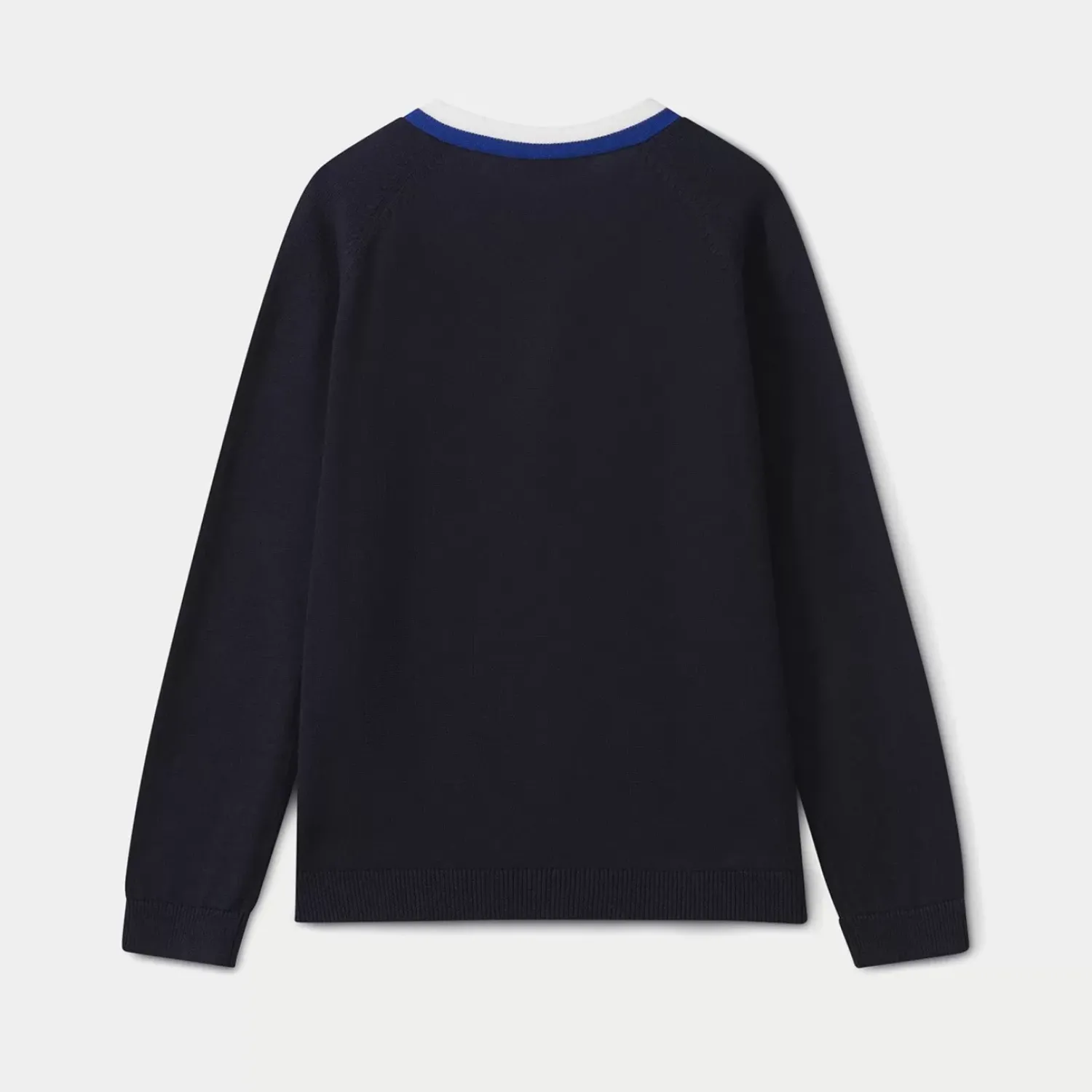 We Love The Originality Of This Cotton Cardigan. The Navy Design Has Pockets On The Front And A White And Azure Blue Stripe Along The Button Placket And V Neck, Adding Light And Energy To The Look.