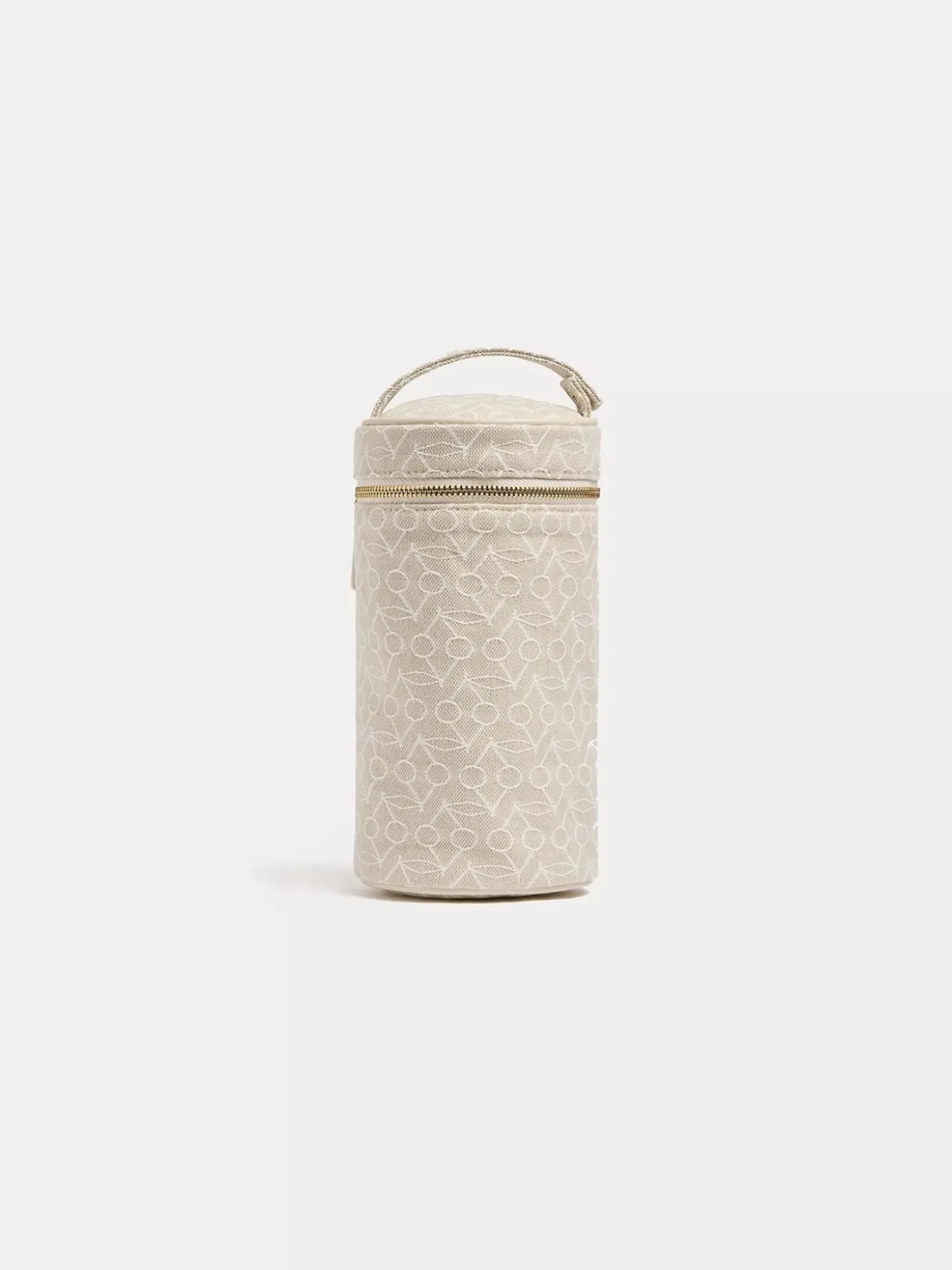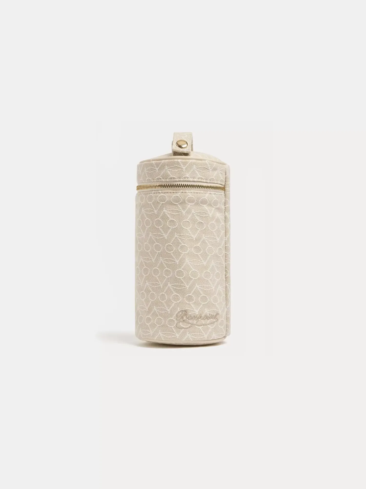 This Dita Bottle Bag Is Adorned With A Distinctive Cherry Print. The Cotton Design Has A Handle On Top Making It Easy To Carry.