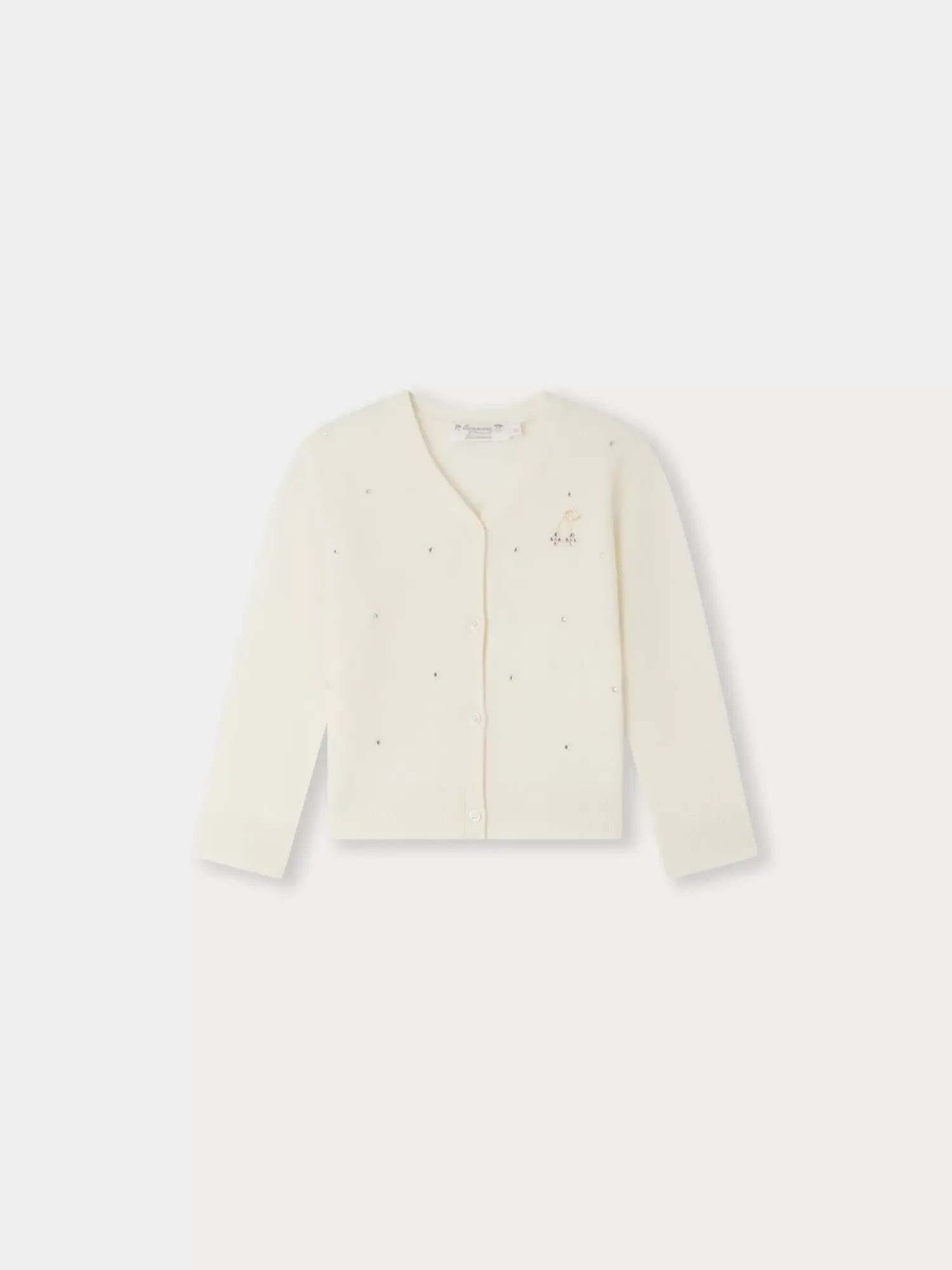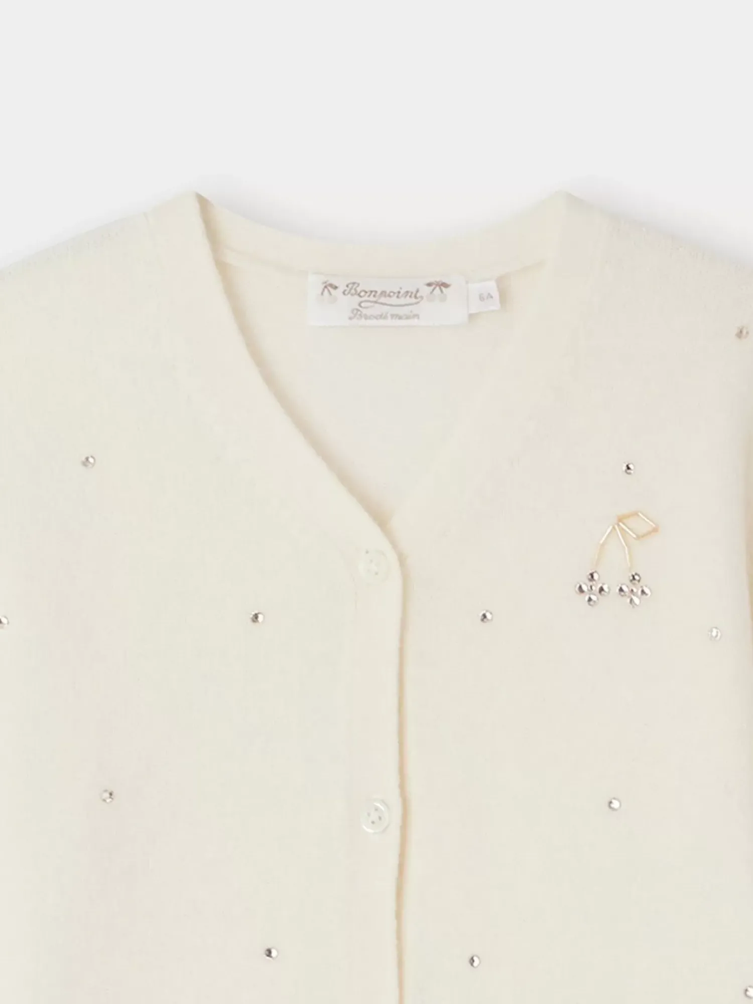 Made From Super Fine Cashmere, This V-Neck, Long-Sleeved Divine Cardigan For Girls Is Embellished With Beads And Rhinestones On The Front. A Hand-Embroidered Cherry Made Of Beads And Rhinestones Adorns The Chest.