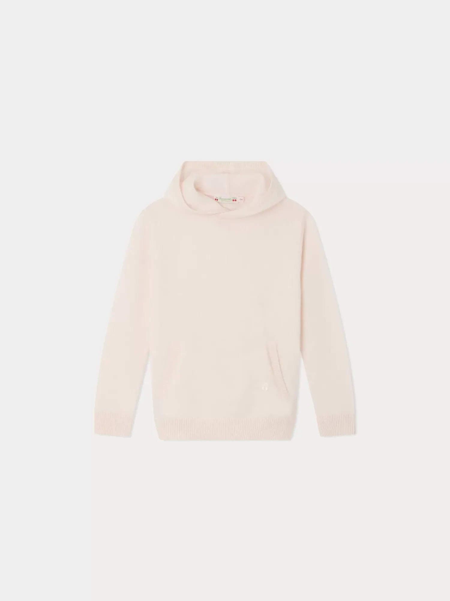 This Thin Cashmere Dodie Sweater For Girls In The Style Of A Hoodie Features A Kangaroo Pocket And Hood. A Tone-On-Tone Embroidered Cherry Adorns The Left Pocket.