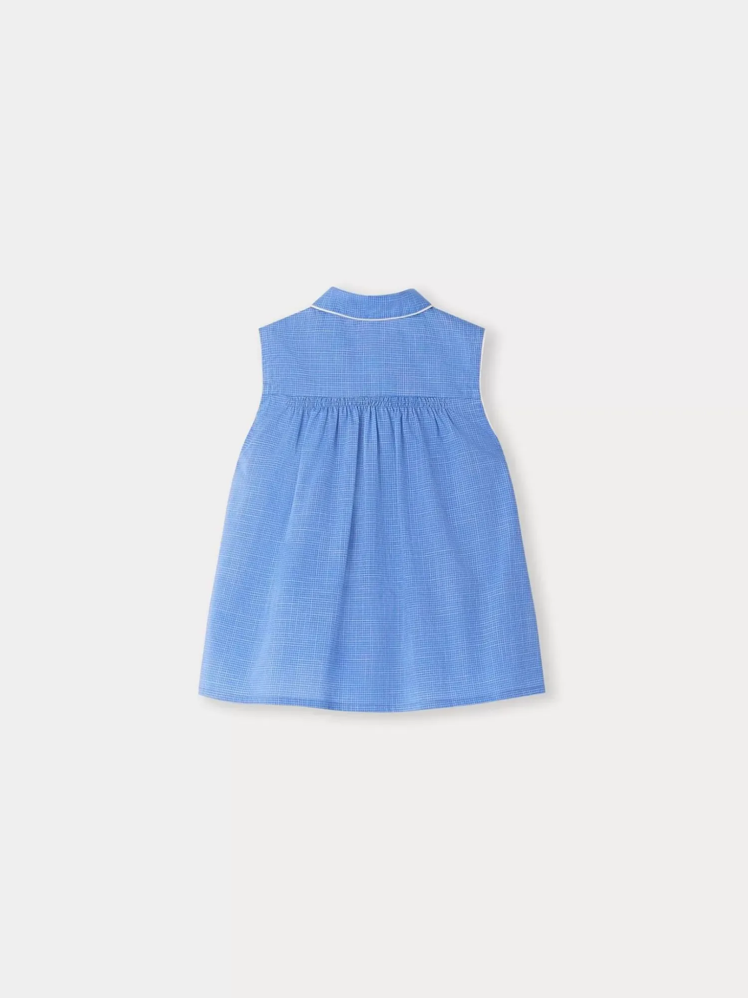 The Eye-Catching Fedra Blouse For Girls Features An Allover, Two-Tone Retro Print Consisting Of Mini Checks. The Turned-Down Collar And Arm Openings Are Trimmed With Contrasting Piping.