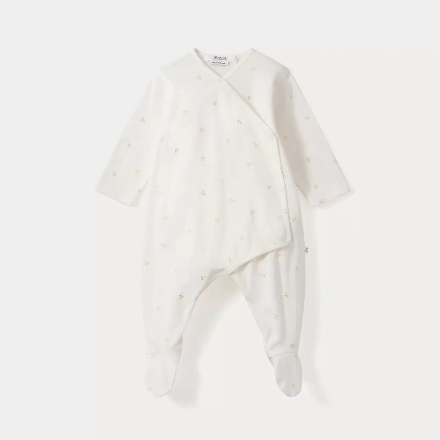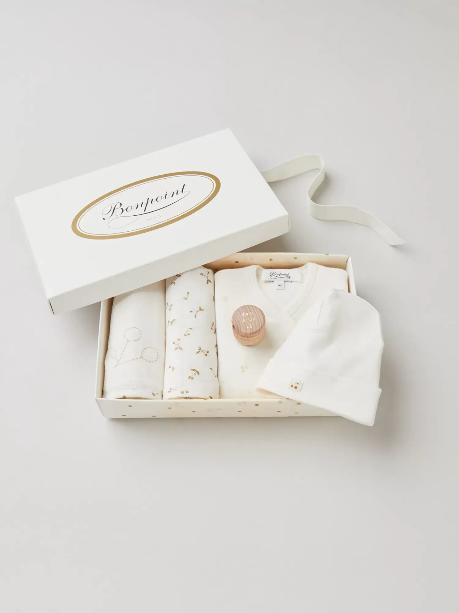 Bonpoint Has Chosen A Soft, Cozy Cotton Twill Pajama Set Featuring Our Iconic Gold Cherry Print In Size 3 Months, Two Matching Double-Layered Cotton Swaddles And A Delicate Cotton Hat With A Comfortable Cuff Adorned With The Brand’S Discreet Cherry Motif.