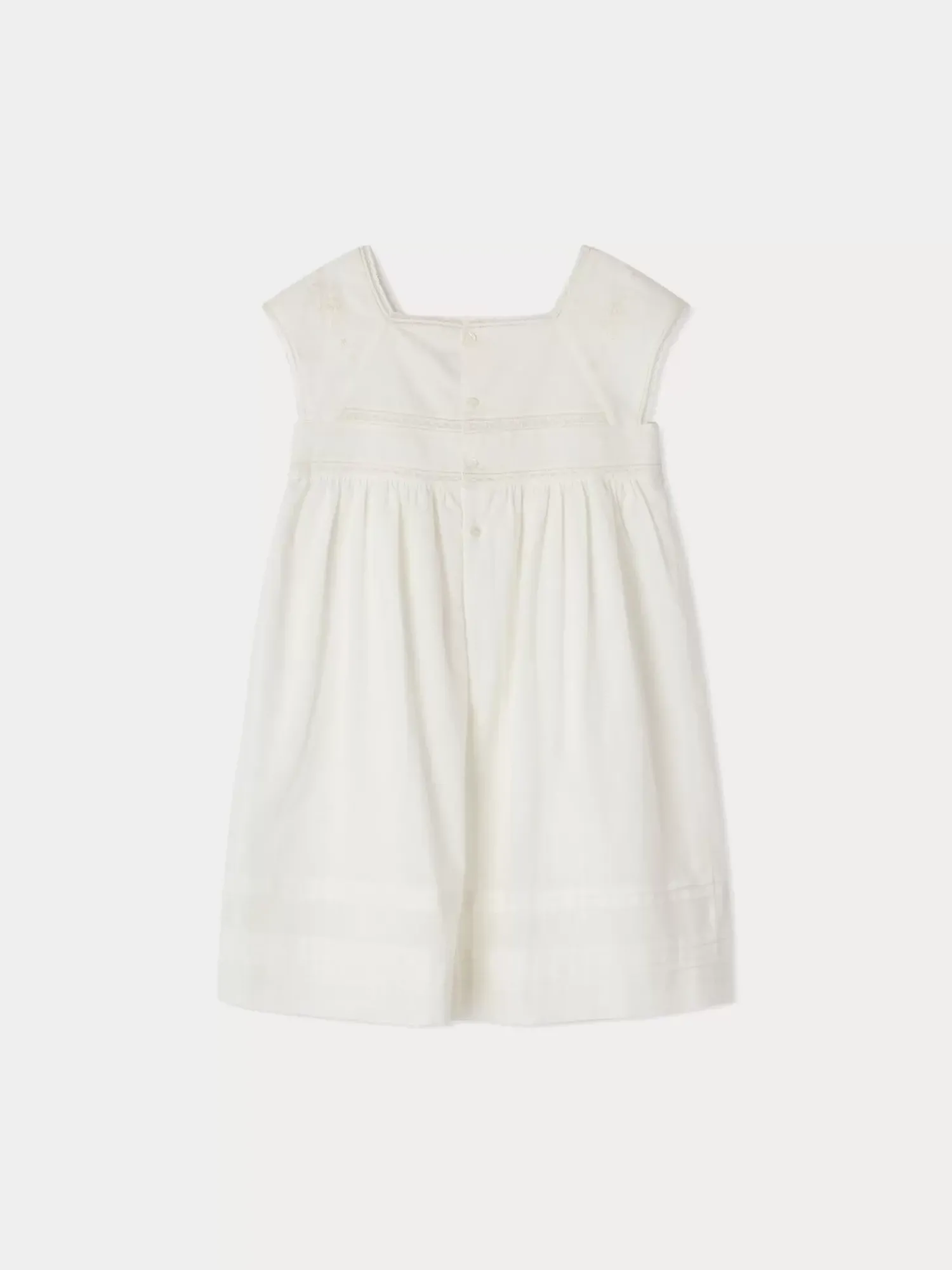 This Framboise Dress For Girls Is Delicately Hand Embroidered And Enhanced By Calais Lace Inserts. The Sleeveless Design Buttons At The Back And Has A Square Neckline.