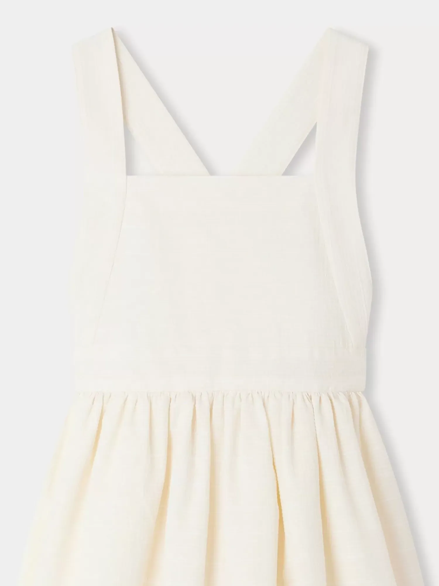 This Solid-Colored, Seersucker Gladys Apron Dress For Girls Is Ideal For Warmer Weather. It Fastens With Wide Criss-Cross Straps Across The Back And 3 Pearly Buttons.