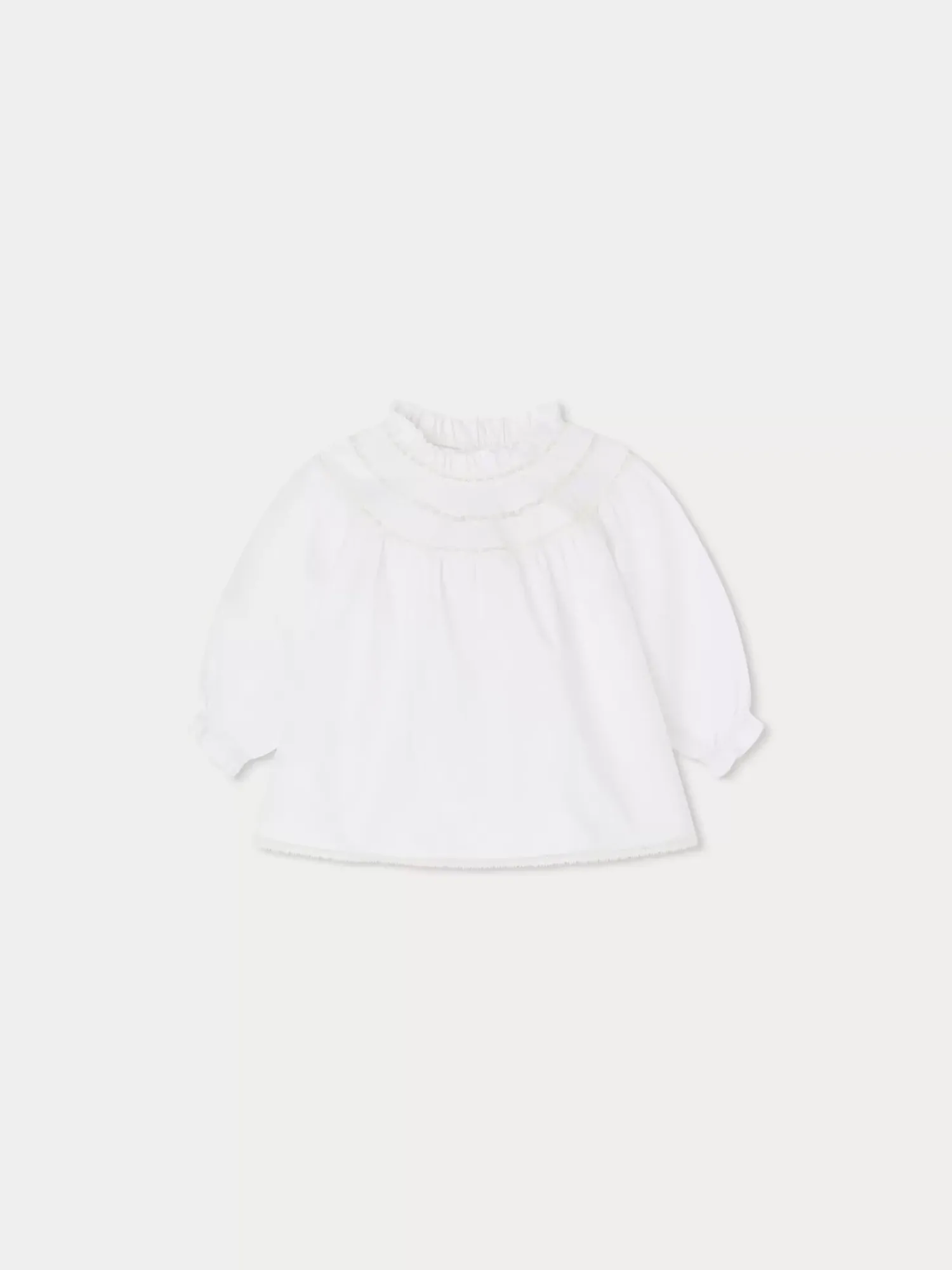 Made From Fine, Soft Certified Organic Cotton, This Solid-Colored Jelexi Blouse For Baby Features Ruffles On The Collar And Wrists. The Petal-Shaped Yoke Is Enhanced With Rows Of Refined Lace Details.