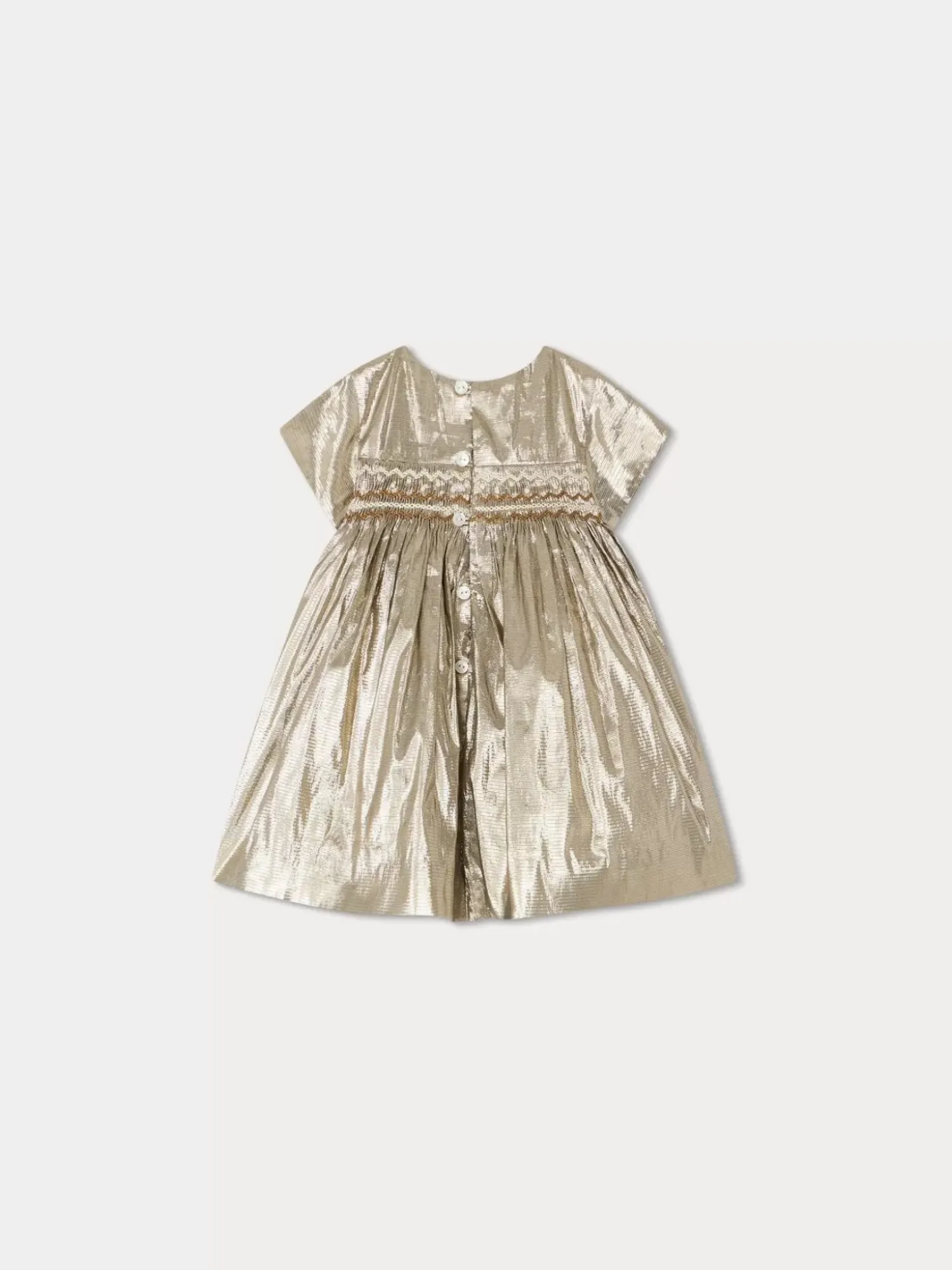 The Maruska Dress For Baby Has Eye-Catching Lamé Fabric Made From A Silk Blend. Matching Hand-Embroidered Smocking Decorates The Bodice And Sits Atop Gathering That Lends Movement To The Flared Cut.