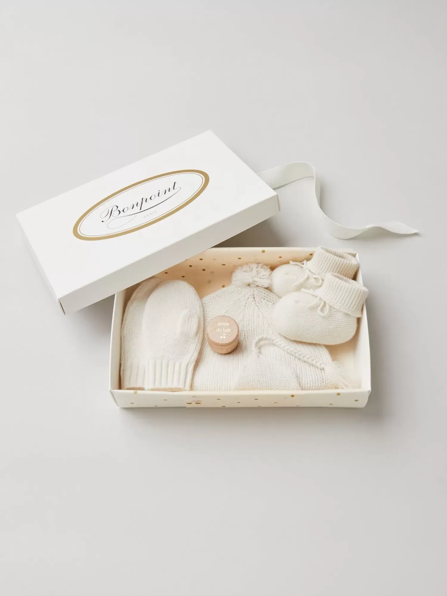 The Peruvian-Style Pompom Hat Will Keep Your Little One’S Ears Warm, The Booties With Elegant Bows And Comfortable Cuffs Will Wrap Baby’S Little Feet In Infinite Softness, While The Mittens Add A Reassuring Retro Touch Thanks To The String That Keeps Them Securely In Place. We Have Included An Engraved Tooth Box, A Signature Piece Of The House, As Our Gift To You.