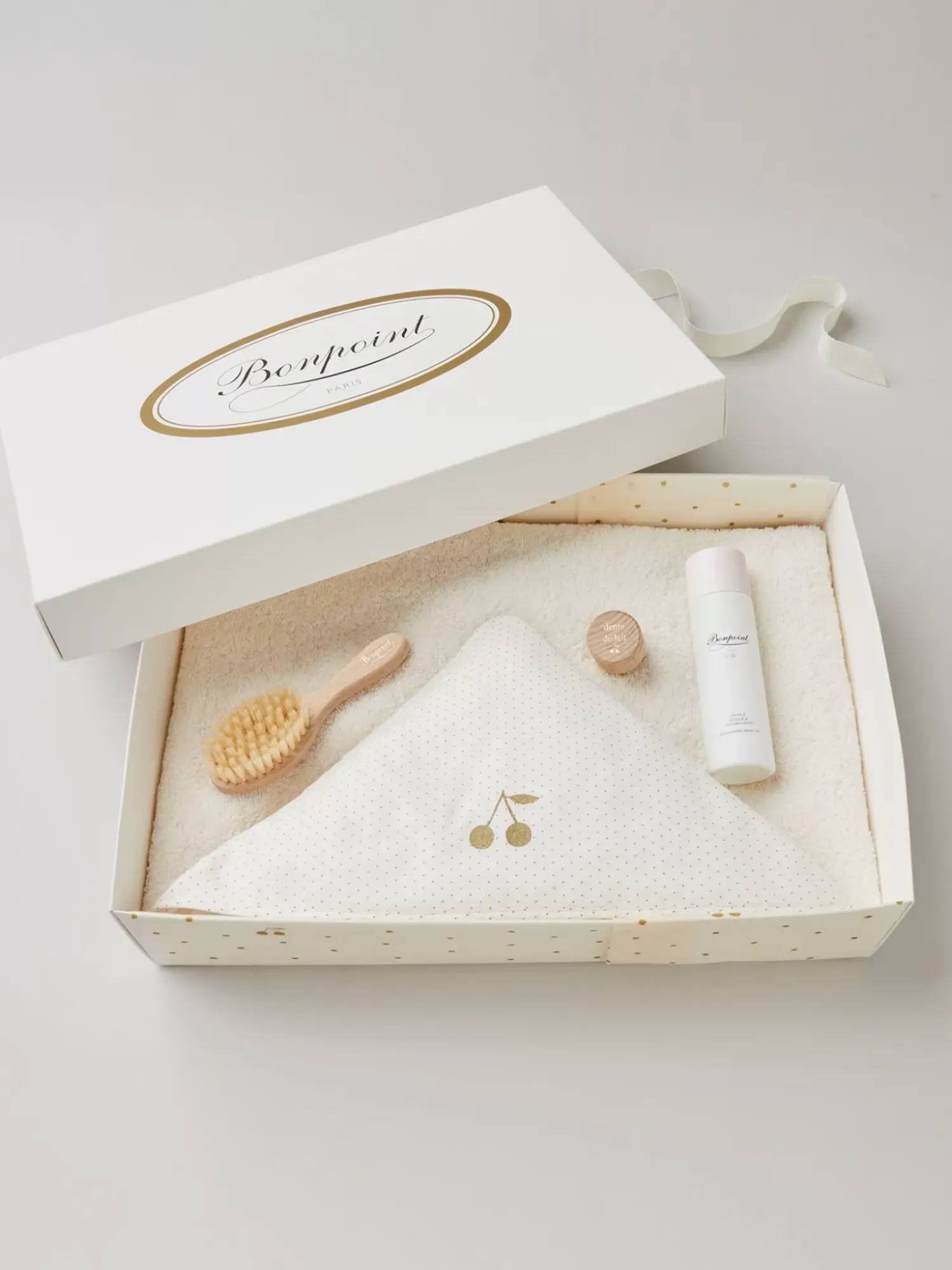 This Box Set Contains A Selection Of Essentials To Complete The Bathing Ritual For Your Newborn. Wrap Him In A Bathrobe After A Relaxing And Soothing Massage With The Soft Oil. The Box Includes The Hairbrush And An Engraved Tooth Box, Signature Of The House, Offered As A Welcome Gift.