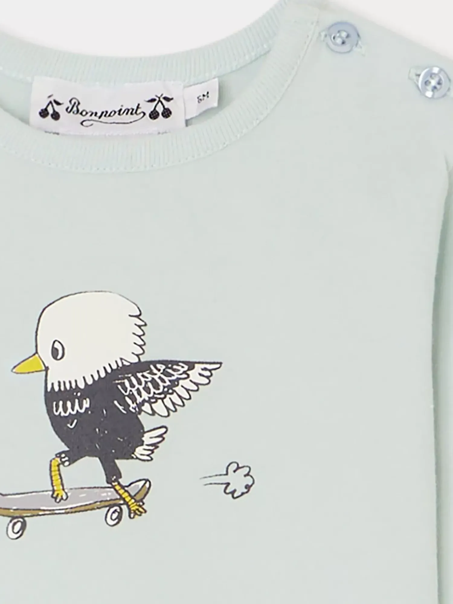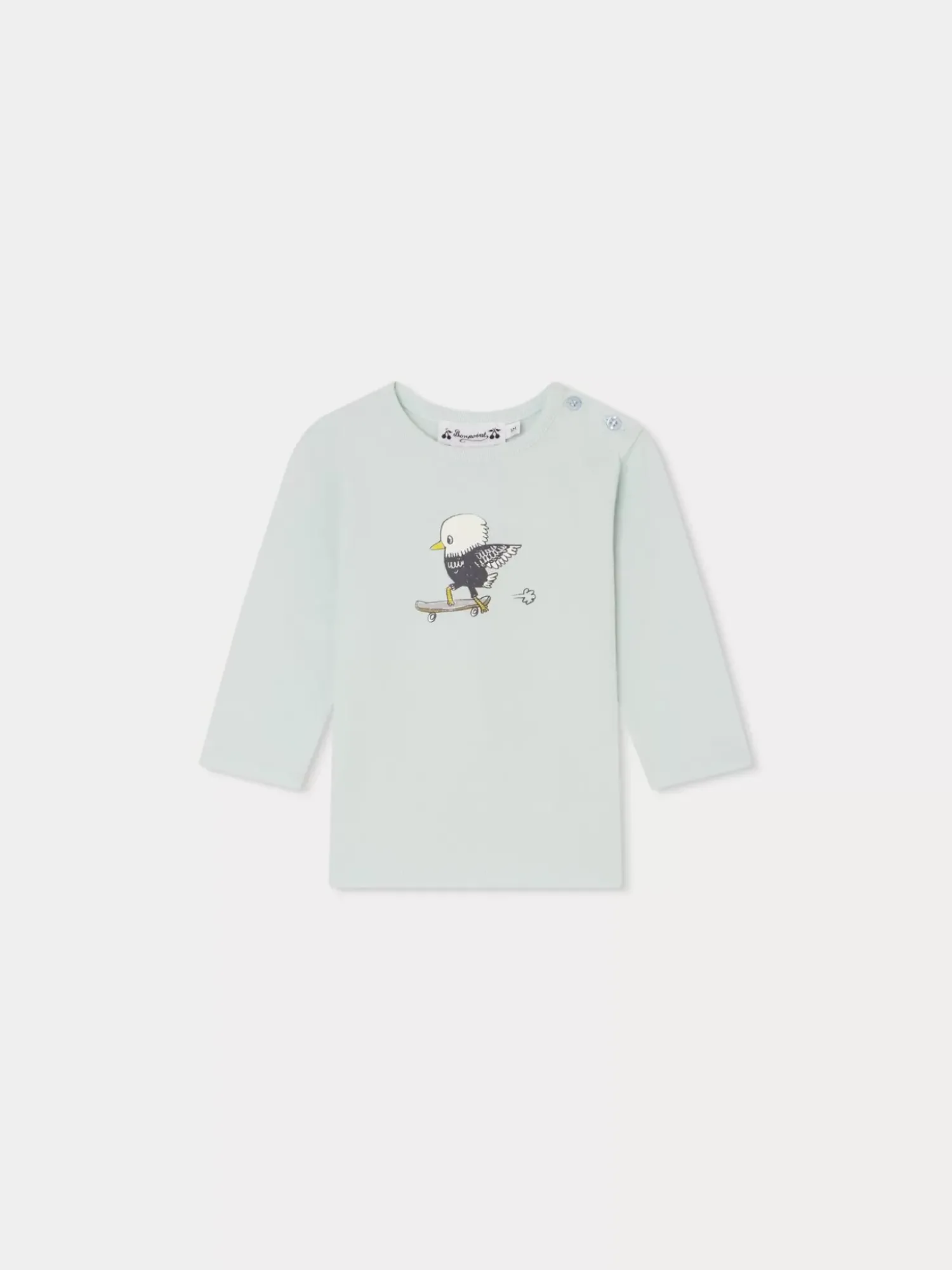 The Long-Sleeved Tahsin T-Shirt For Baby Fastens At The Shoulder With Buttons. This Must-Have Bonpoint Garment Is Made From Organic Cotton And Decorated With A Skateboarding-Bird Design.