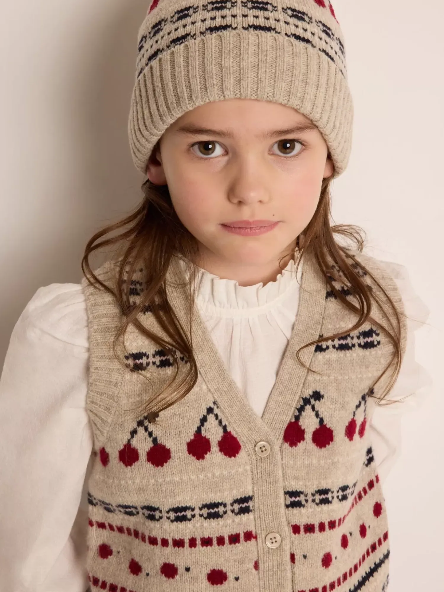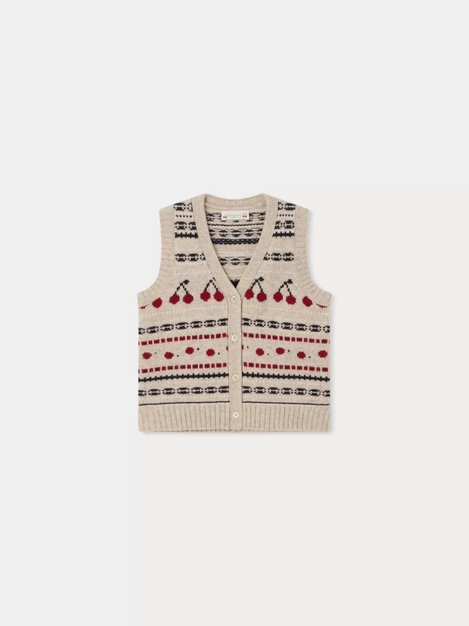 The Thevy Cardigan For Girls Offers A Vintage Style With Its Original Sleeveless Cut. Jacquard Cherries And Other Patterns Decorate The Horizontal Stripes.