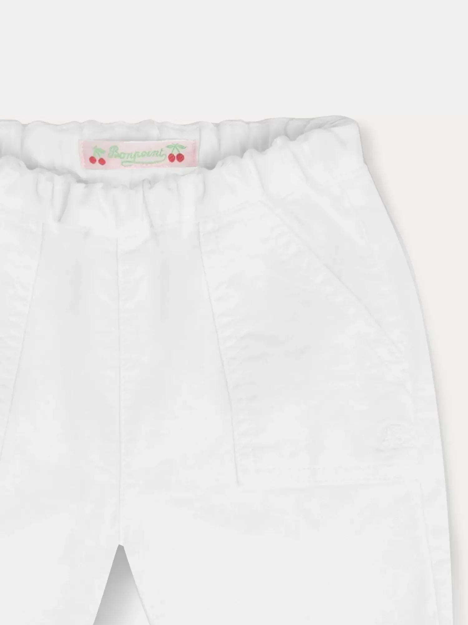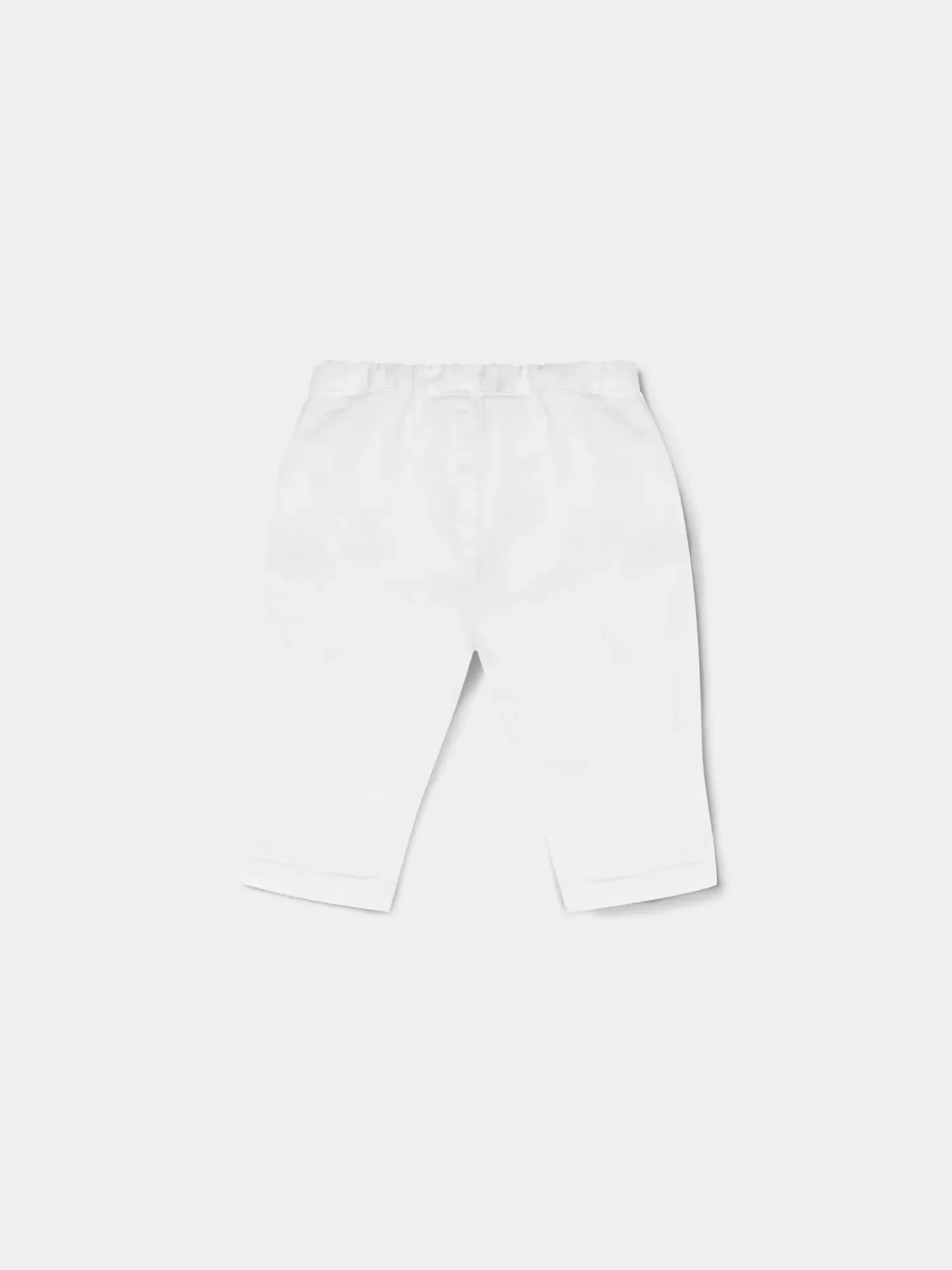 These Thursday Pants Give A Neat And Tidy Look As Well As Comfort To Babies. Styled In Stretch Cotton And With An Elasticated Waistband, They Give Great Freedom Of Movement. They Are Embellished With Two Patch Pockets In Front. The White Color Goes Well With A Dark Velvet Jacket.