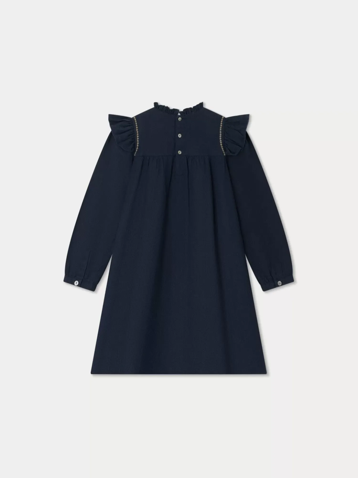 This Long-Sleeved Dress Is Made From Wool And Cotton And Is Decorated By A Gathered Neck, Ruffles At The Shoulder, And Gathers Below The Yoke. This Model Is Enhanced By Contrasting Embroidery At The Front.