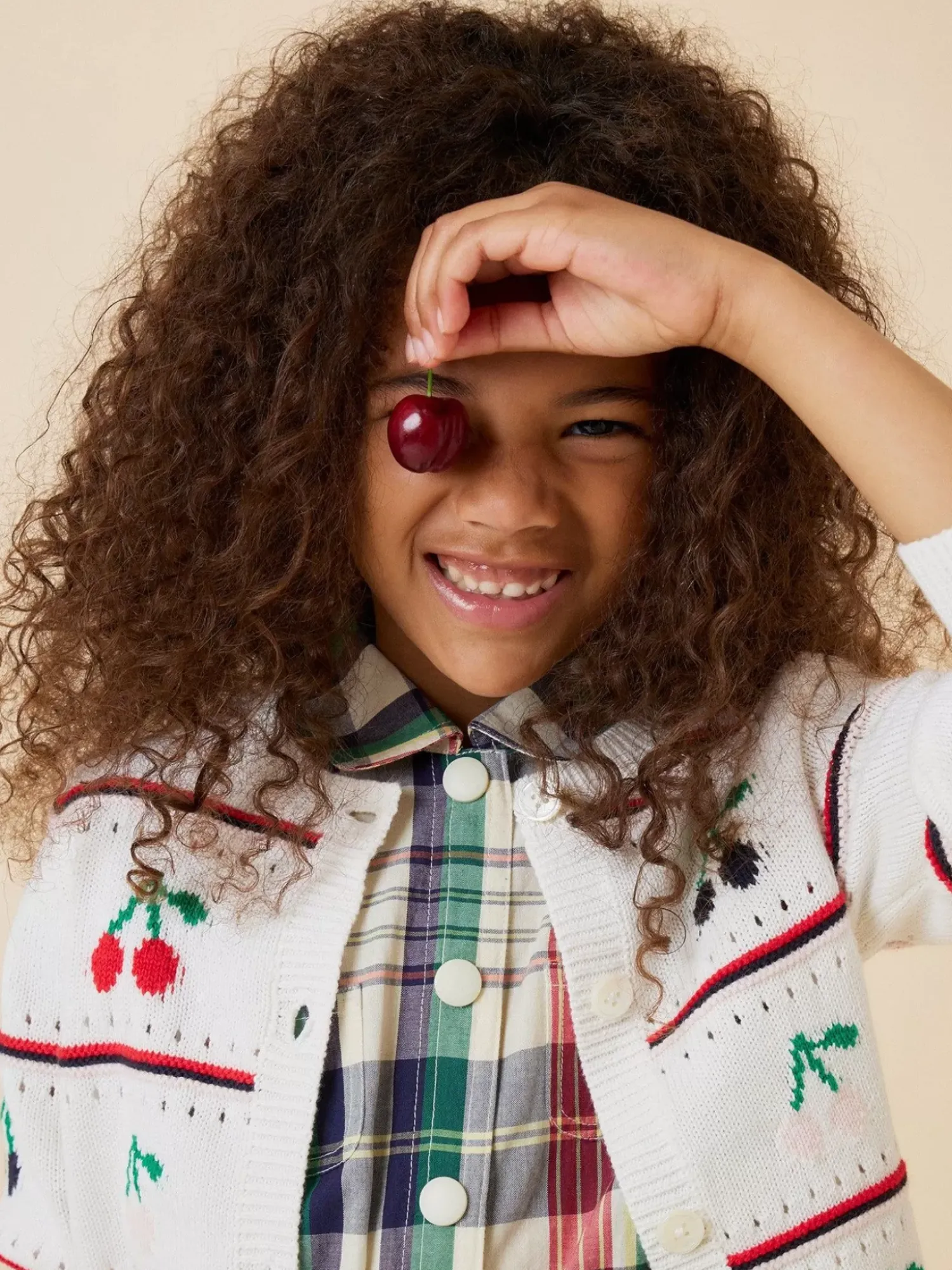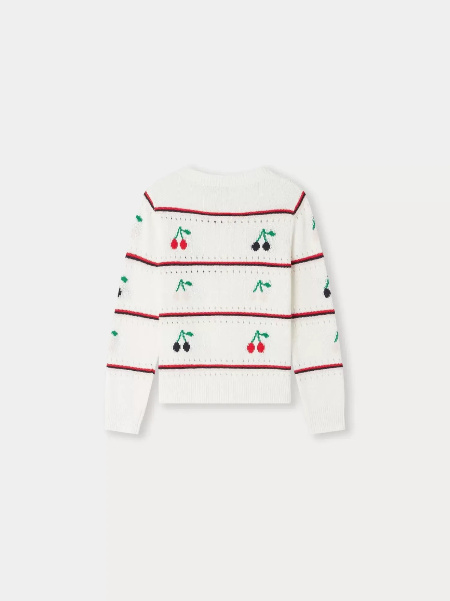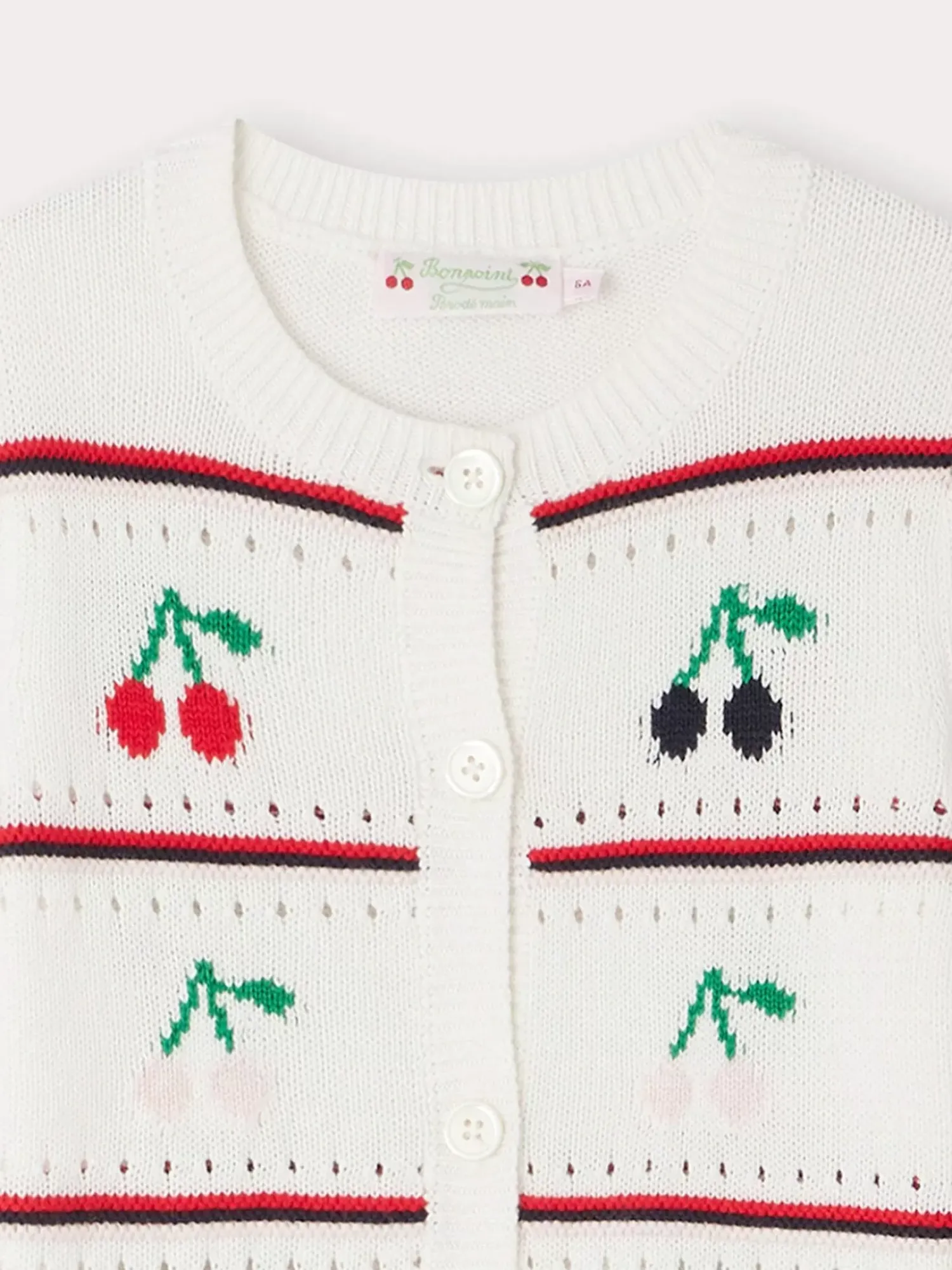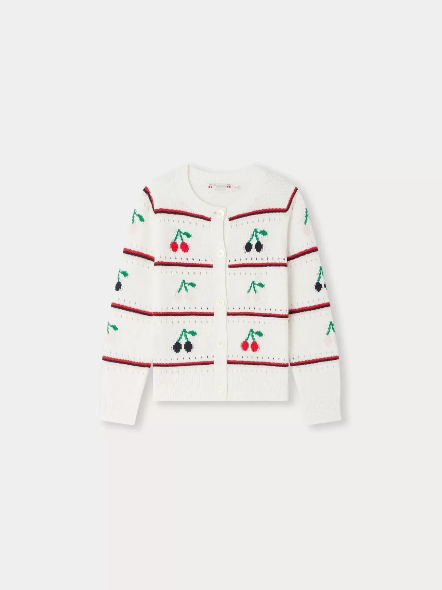The Buttoned Armel Cardigan For Girls Will Add A Fresh And Colorful Touch To An Outfit, Thanks To Its Cherry Pattern With Thin Stripes. It Is Made From A Lightweight Organic Cotton.