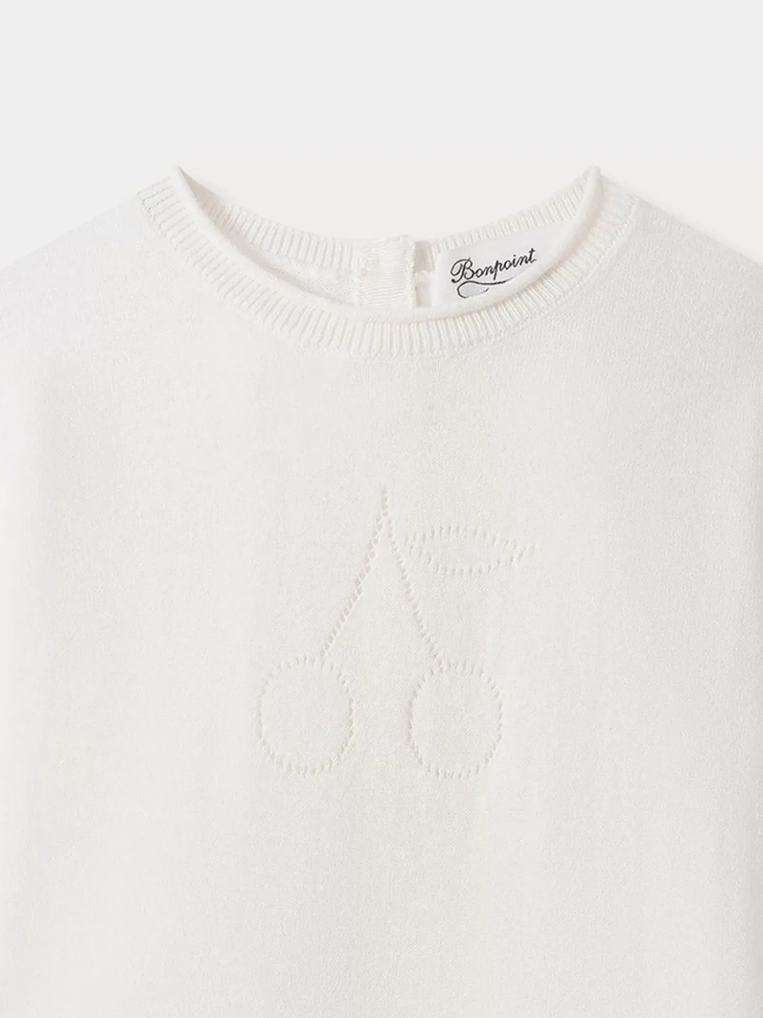 This White Cotton Babies’ Sleepsuit Is Perfect For Lounging Around The House In Cold Weather. It Is Embellished With A Topstitched Cherry On The Front, And Has Snap Fastenings At The Back And Between The Legs For Easy Dressing.
