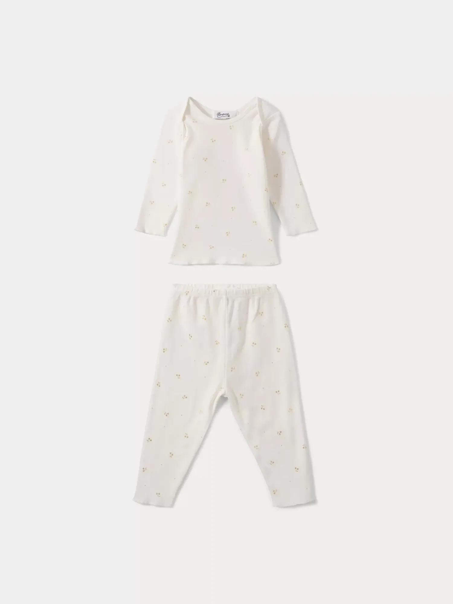 This Babies’ Two-Piece Pajama Set Will Keep Your Little One Stylish Day And Night. The Long-Sleeved Top And Pants With An Elasticated Waistband Are Both Made From White Cotton Material Decorated With Little Golden Cherries, For A Poetic Look.
