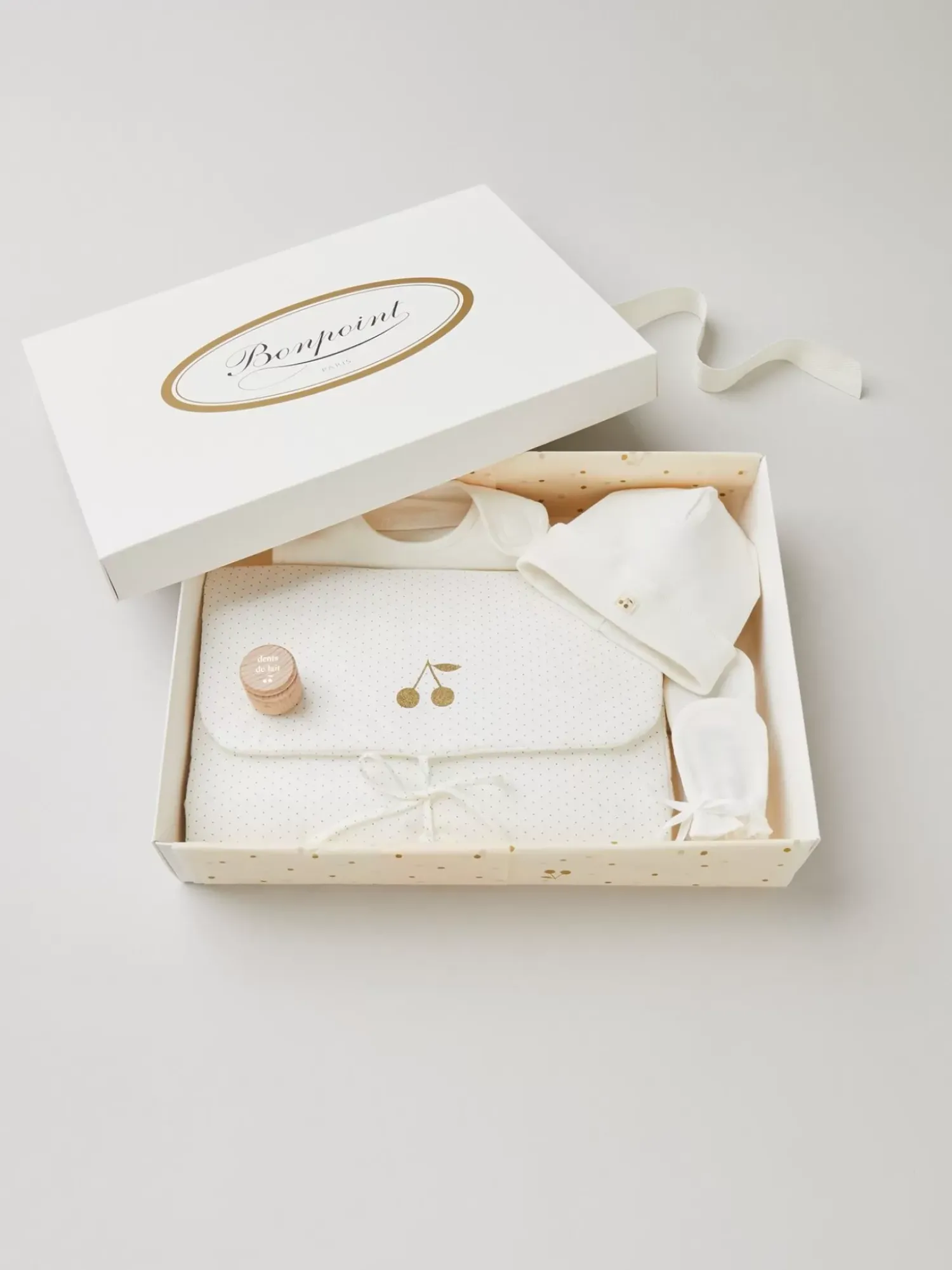 It Features A Delicate Cotton Hat With A Comfortable Cuff Decorated With The Discreet Bonpoint Cherry Motif, A Pair Of Mittens And A Matching Bib.