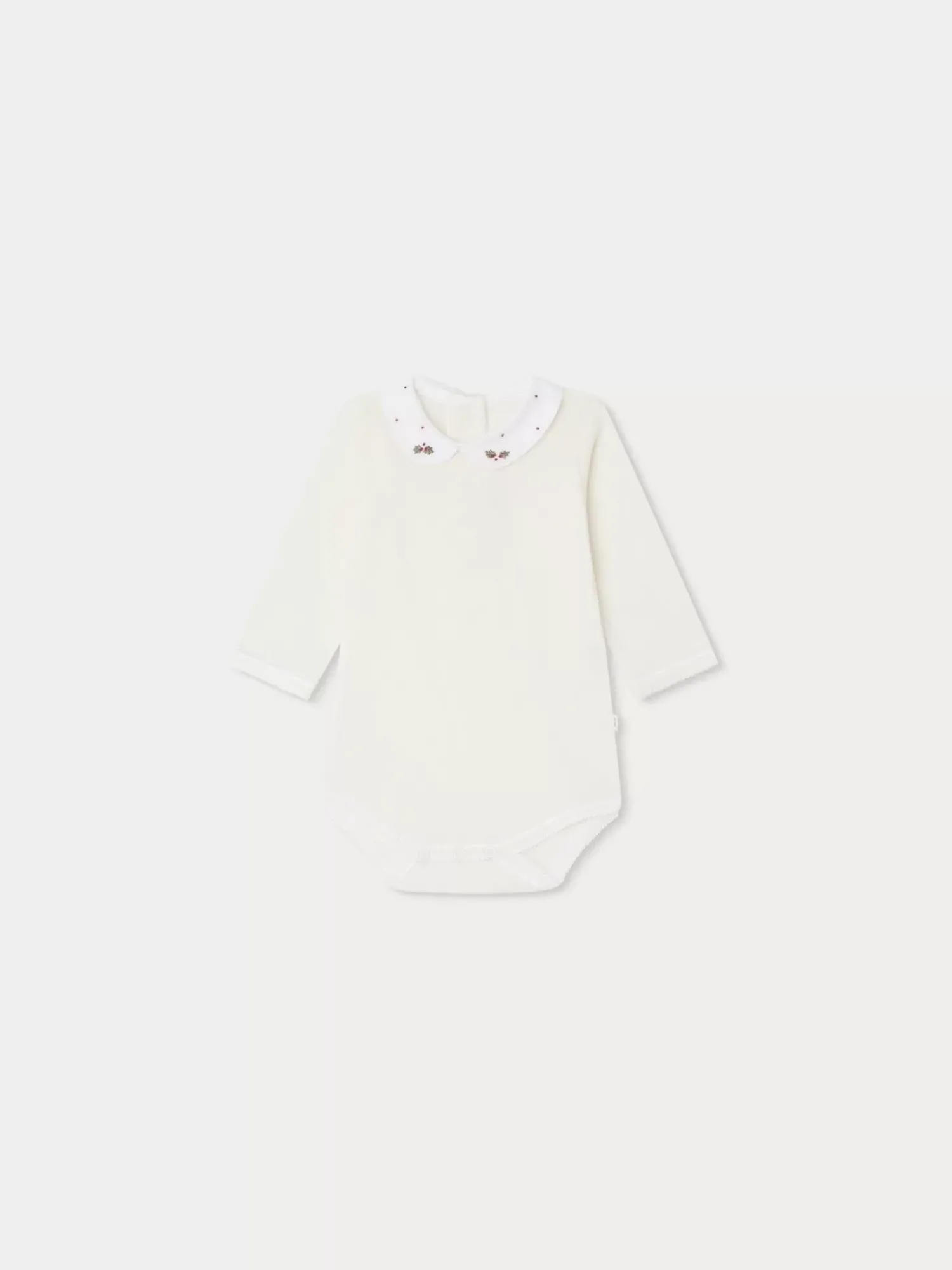 This Cygne Bodysuit For Babies Stands Out From The Rest Thanks To The Holly Embroidered On Its Elegant Peter Pan Collar. It Is Made From Organic Cotton And Fastens With Snap Buttons At The Back And Along The Crotch.