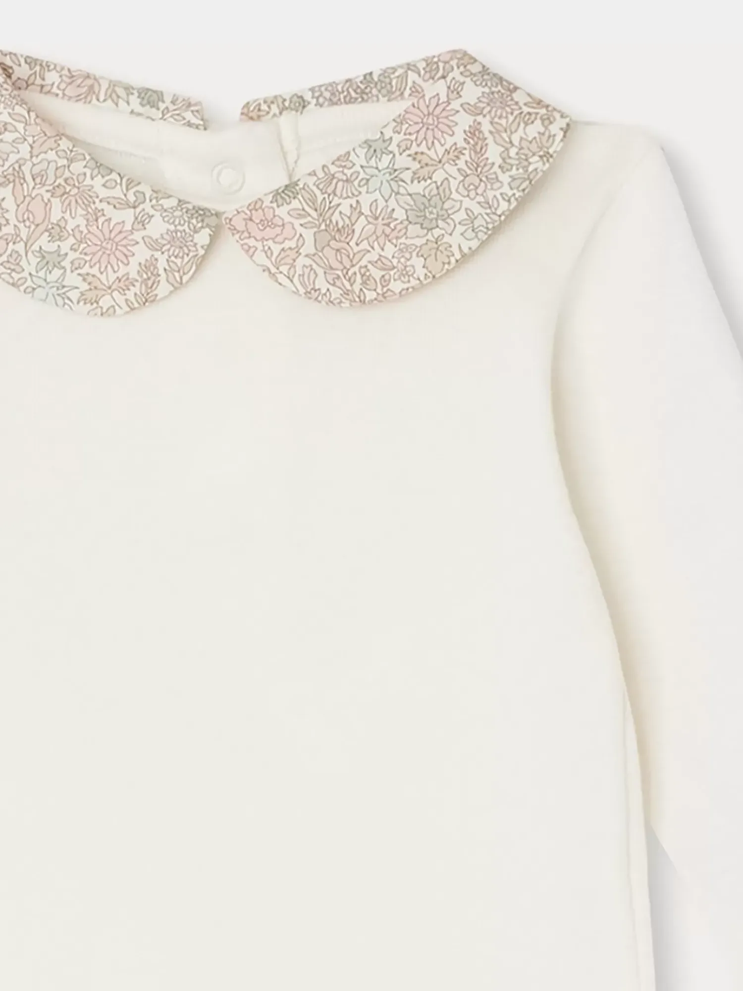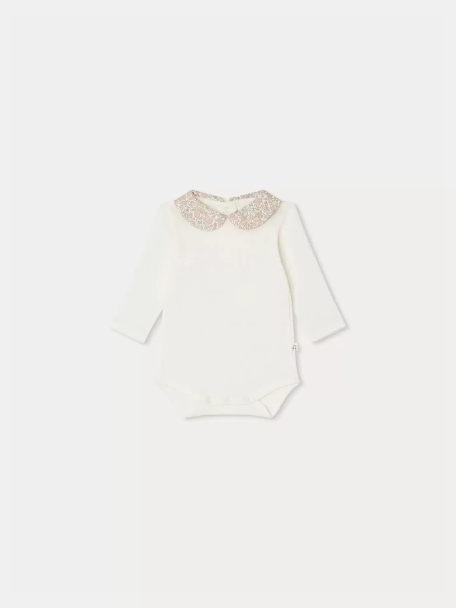 This Cygne Onesie For Baby Features A Lovely Contrasting Collar With A Floral Print. Made From Certified Organic Cotton, It Has A Subtle Snap-Button Fastening At The Back For Easy Dressing.