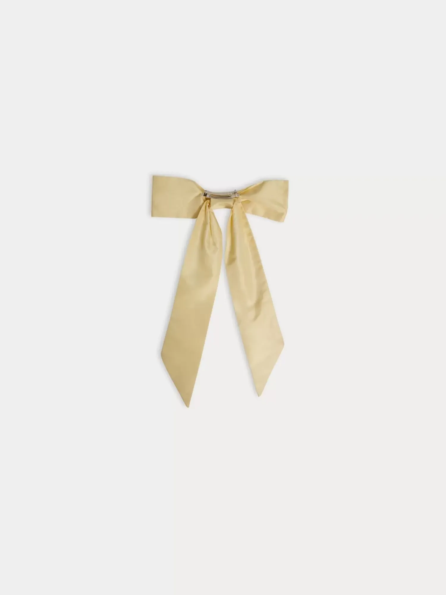 This Solid-Colored, Natural Silk, Domina Barrette For Girls Features A Flat Bow And Long Ribbon Tails. Made For Long Hair, This Accessory Elevates Any Special Occasion Outfit.