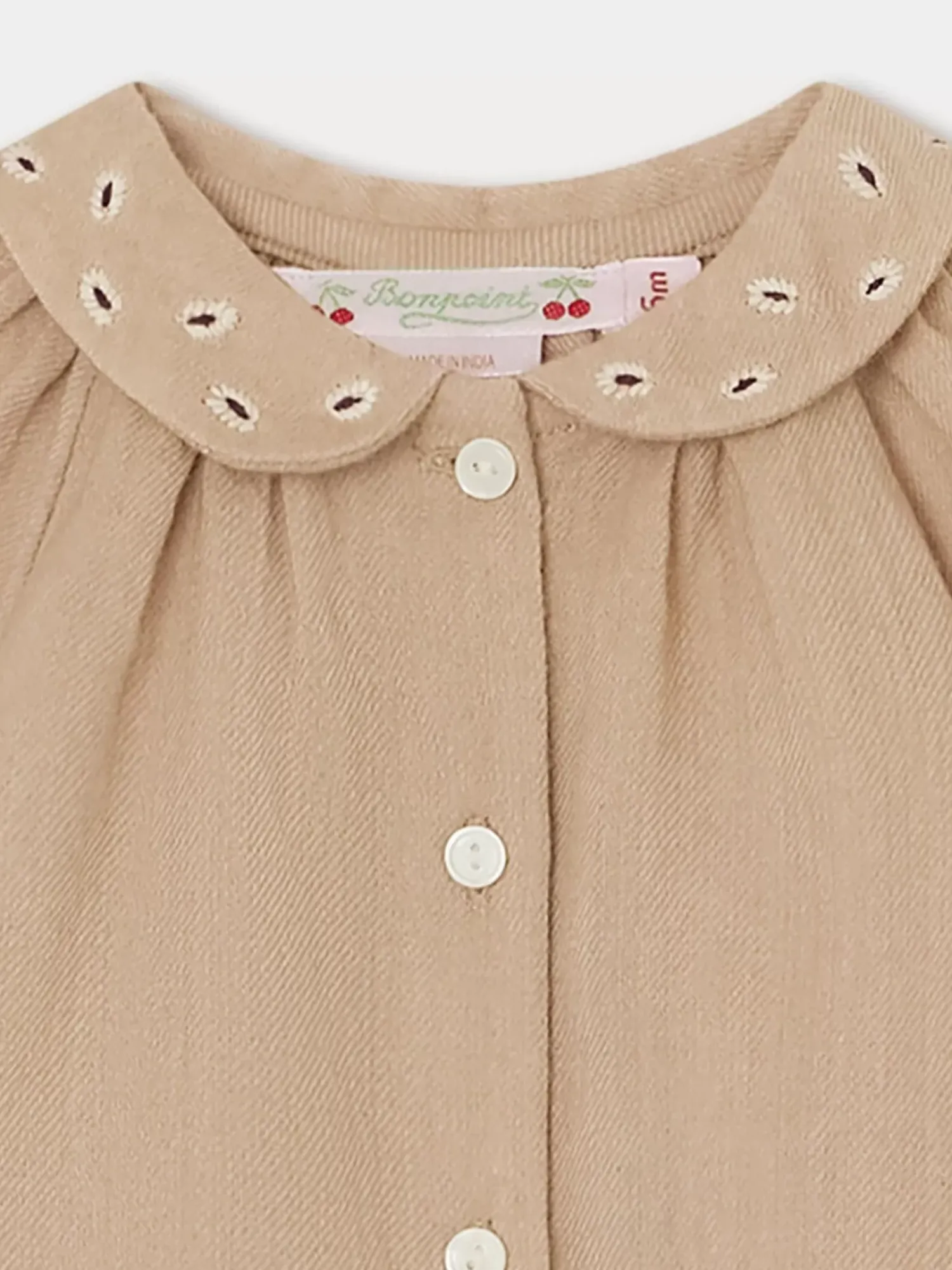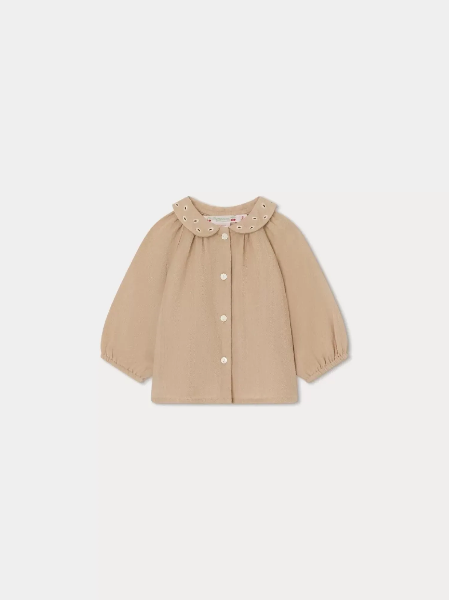 Made From A Wool And Cotton Blend, This Long-Sleeved, Flared Domino Blouse Will Keep Baby Nice And Warm. The Two-Tone Embroidery On The Collar Enhances This Solid-Colored Top.