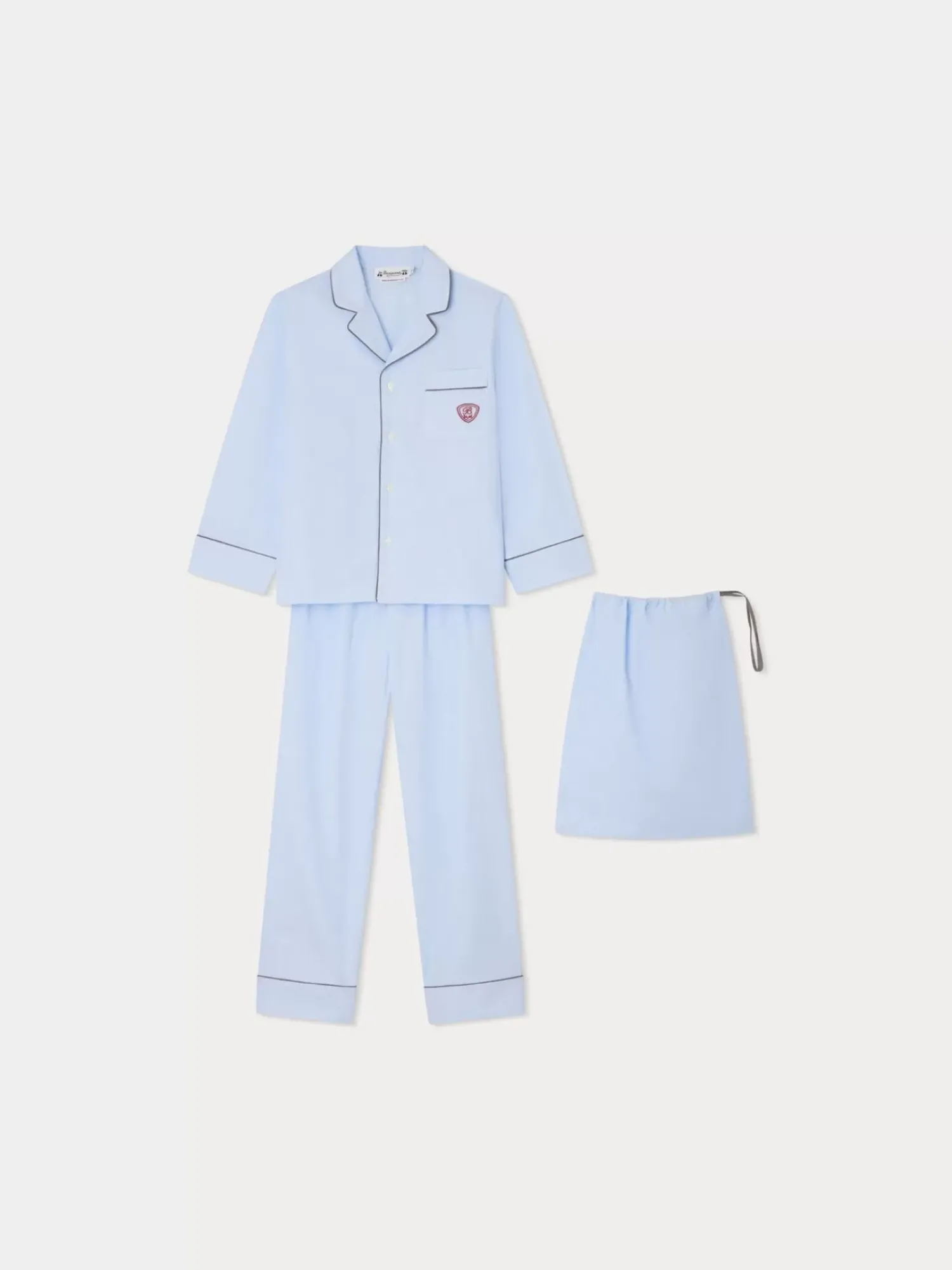 These Refined Dormeur Pajamas For Boys Are Accented With Piping Details In A Darker Shade Of Blue. The Set Includes A Shirt And Pants. A Bonpoint Logo Adorns The Chest Pocket.