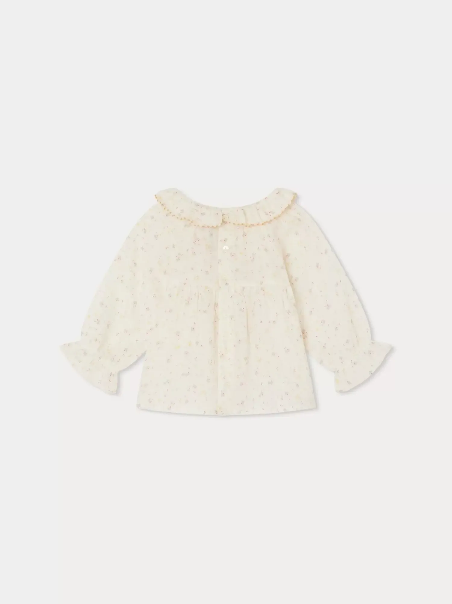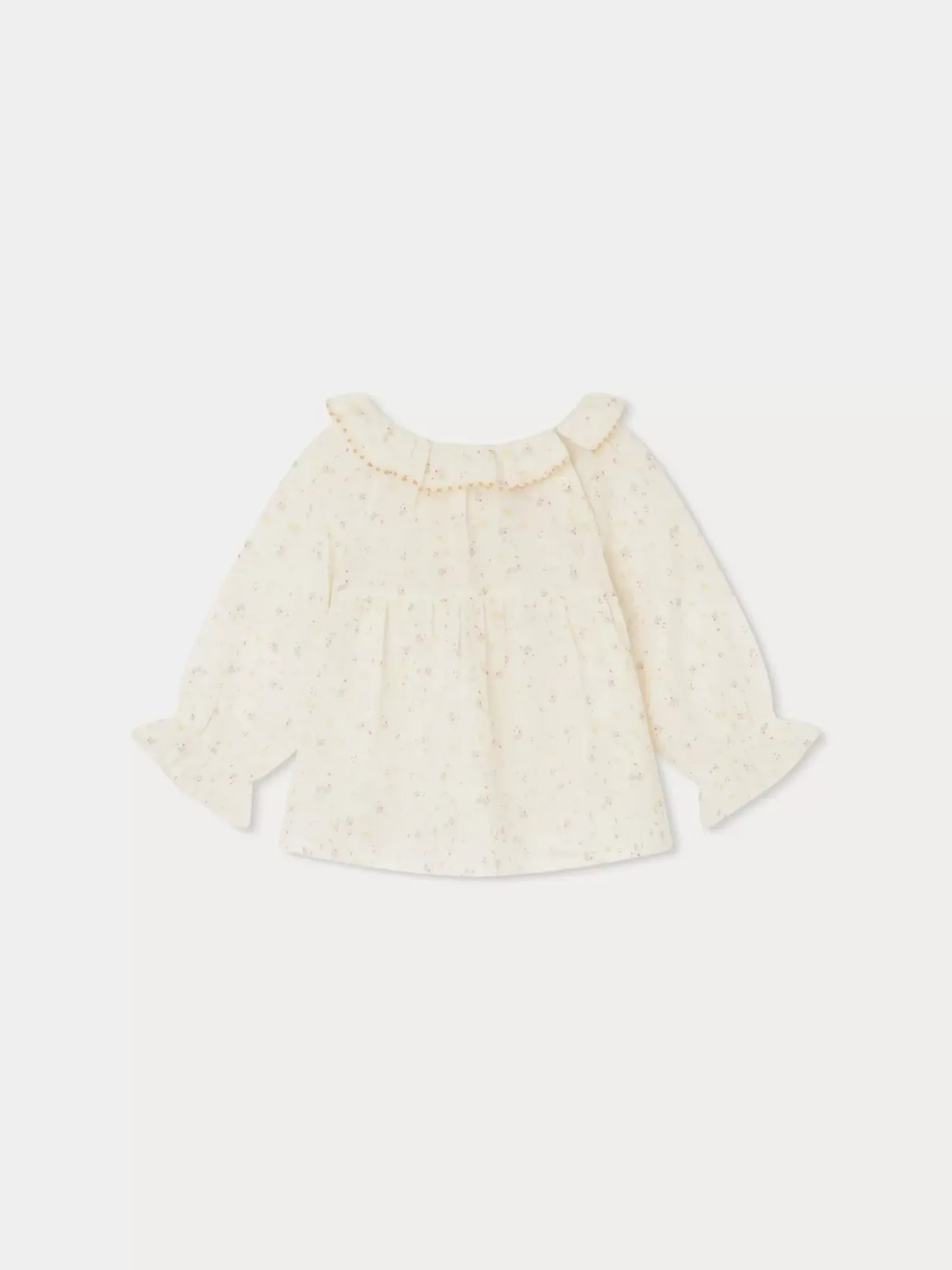 Adorned With A Delicate House Print, This Melly Blouse For Baby Features Embroidered Contrasting Dots On The Collar And Long Ruffled Sleeves. The Buttons On The Back Make It Easy To Dress Your Little One.