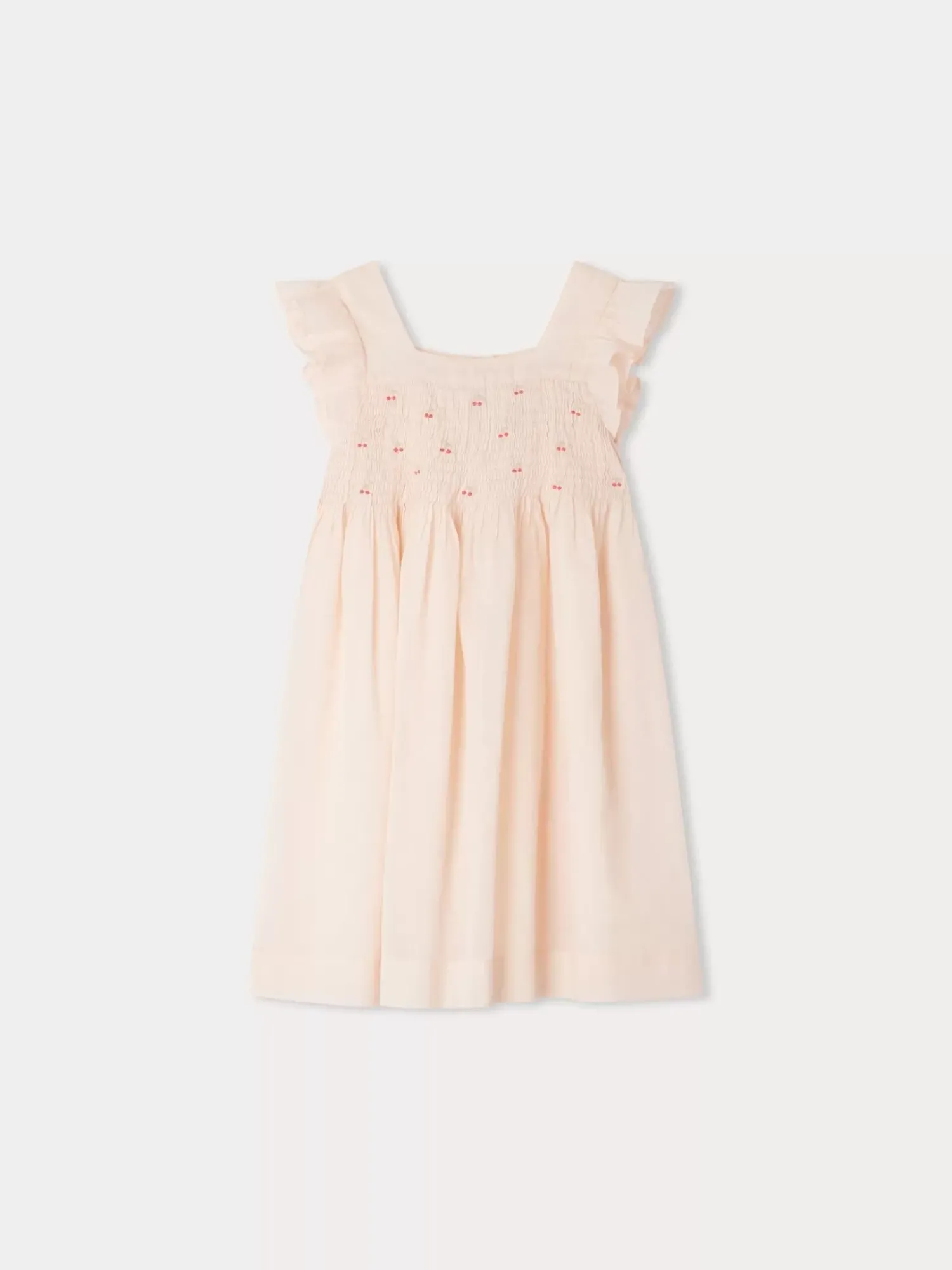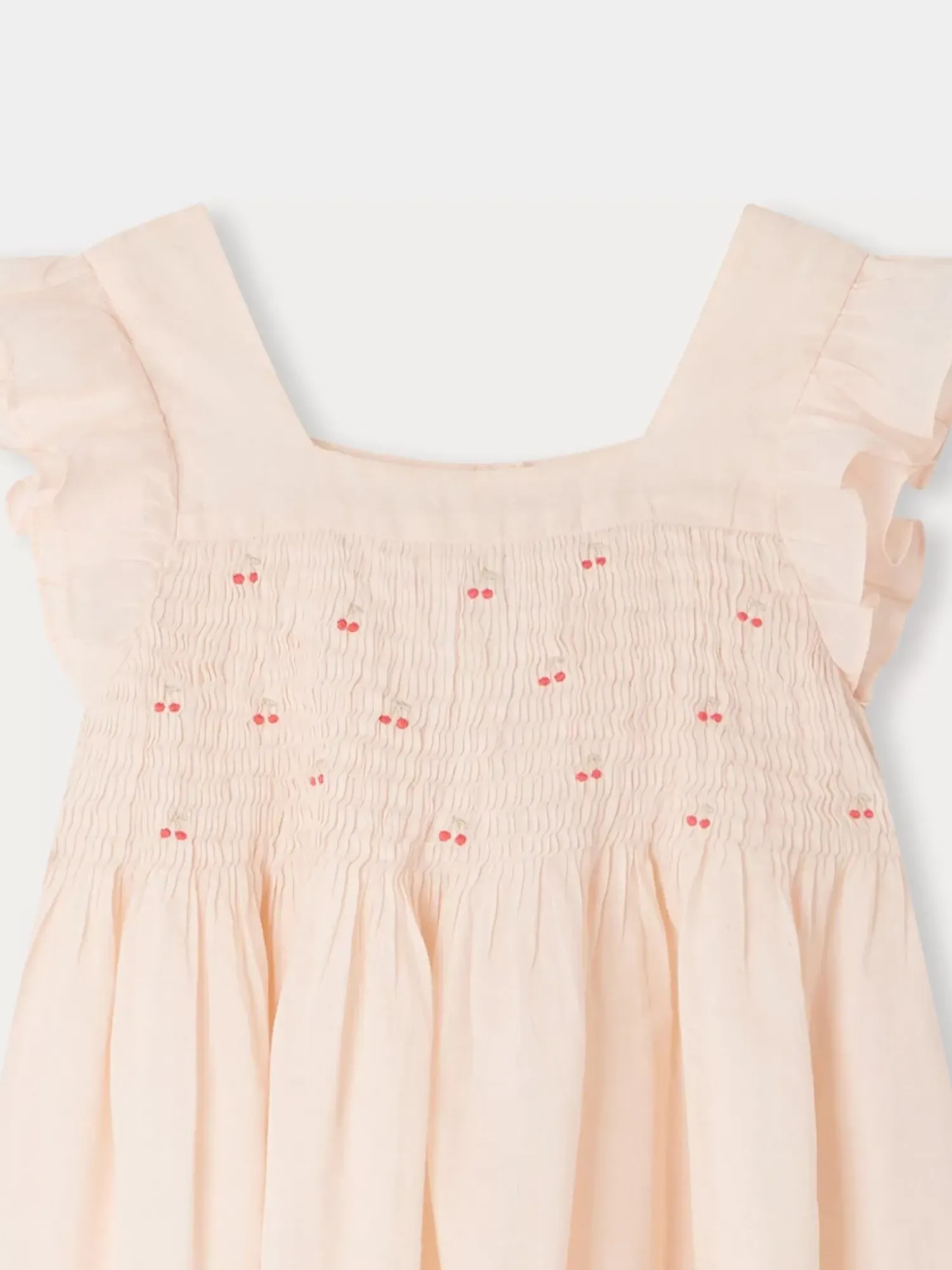 The Fiona Dress For Girls Is The Perfect Choice For A Special Occasion With Its Eye-Catching Smocking At The Front, Adorned With Colorful Delicately Embroidered Cherries. The Short Sleeves Are Enhanced By Wide Ruffles.