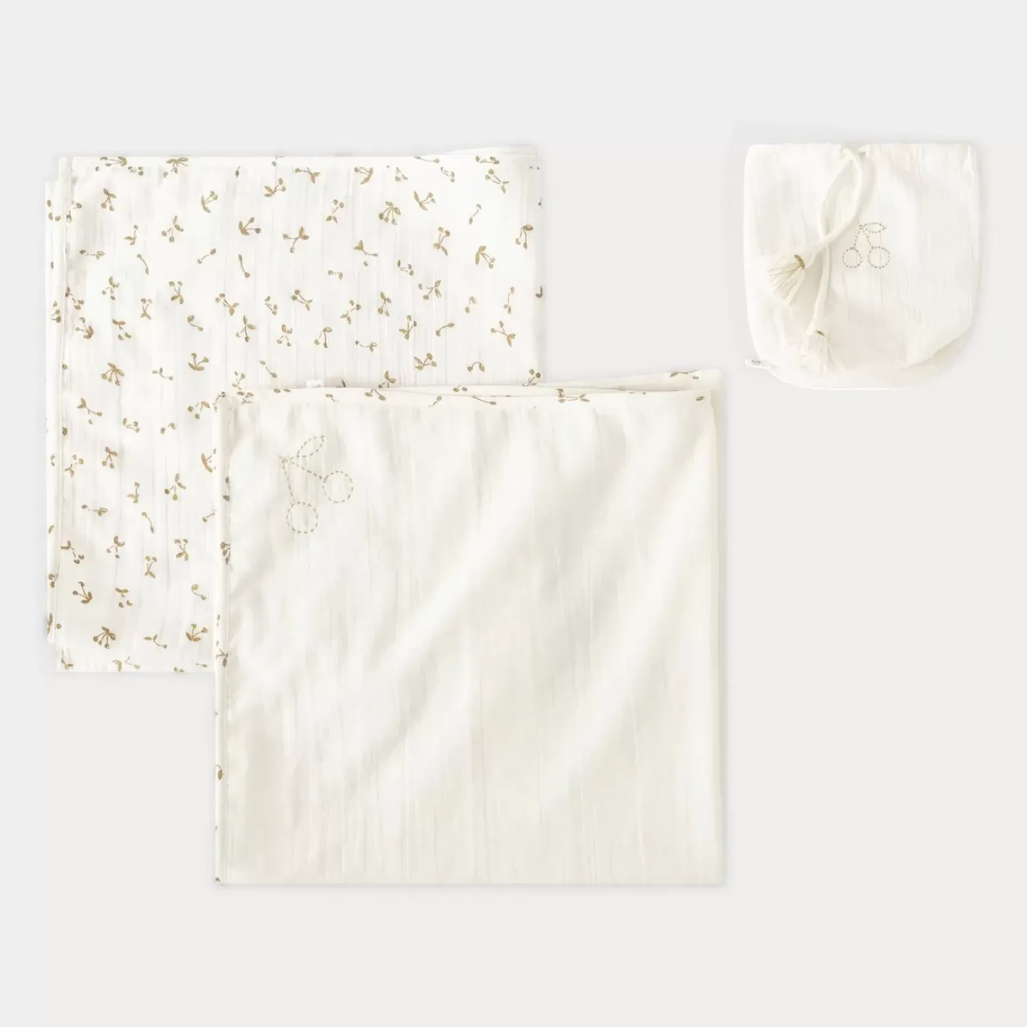 Bonpoint Has Chosen A Soft, Cozy Cotton Twill Pajama Set Featuring Our Iconic Gold Cherry Print In Size 3 Months, Two Matching Double-Layered Cotton Swaddles And A Delicate Cotton Hat With A Comfortable Cuff Adorned With The Brand’S Discreet Cherry Motif.