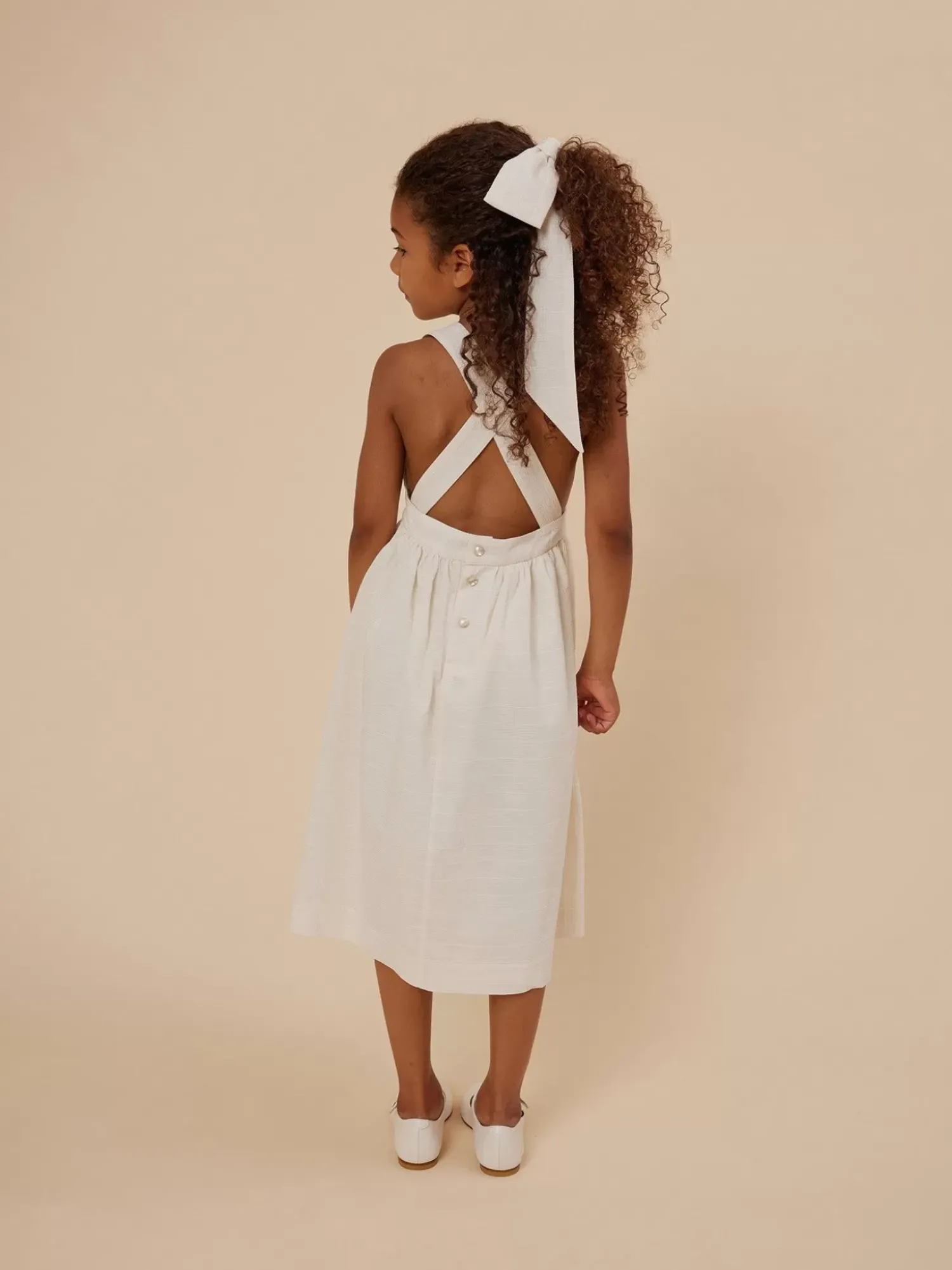 This Solid-Colored, Seersucker Gladys Apron Dress For Girls Is Ideal For Warmer Weather. It Fastens With Wide Criss-Cross Straps Across The Back And 3 Pearly Buttons.