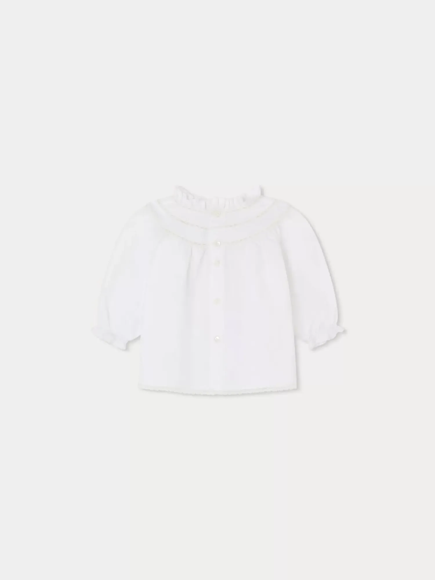 Made From Fine, Soft Certified Organic Cotton, This Solid-Colored Jelexi Blouse For Baby Features Ruffles On The Collar And Wrists. The Petal-Shaped Yoke Is Enhanced With Rows Of Refined Lace Details.