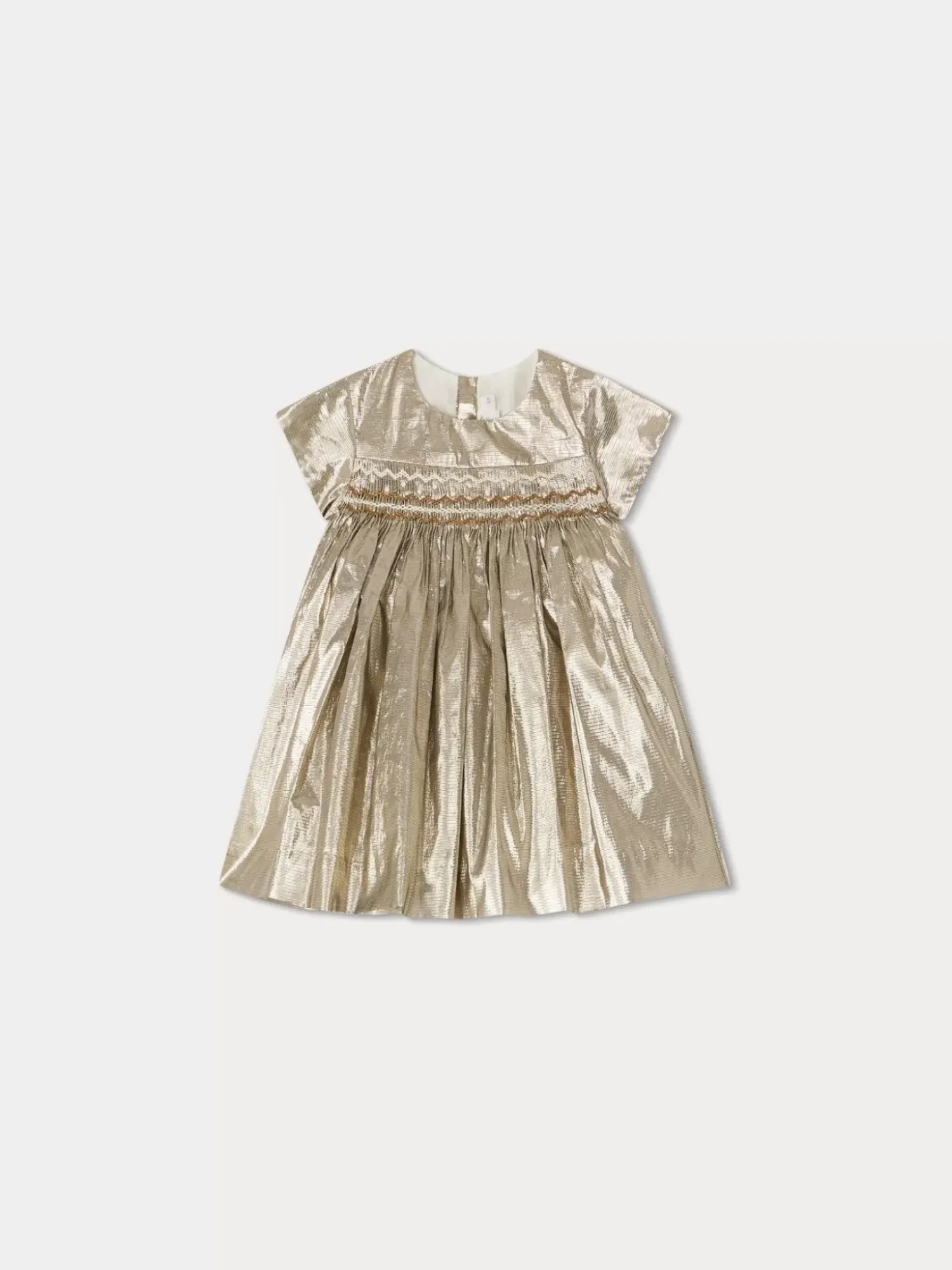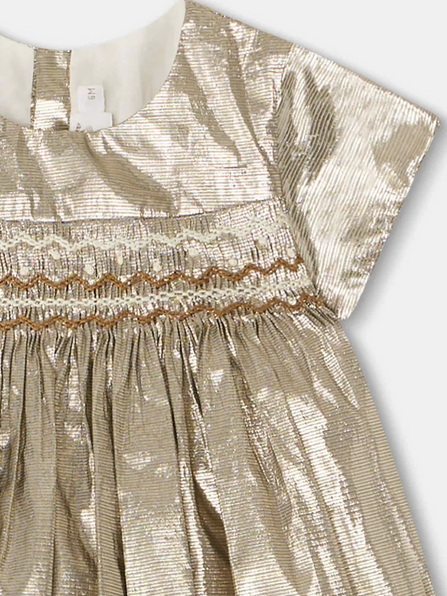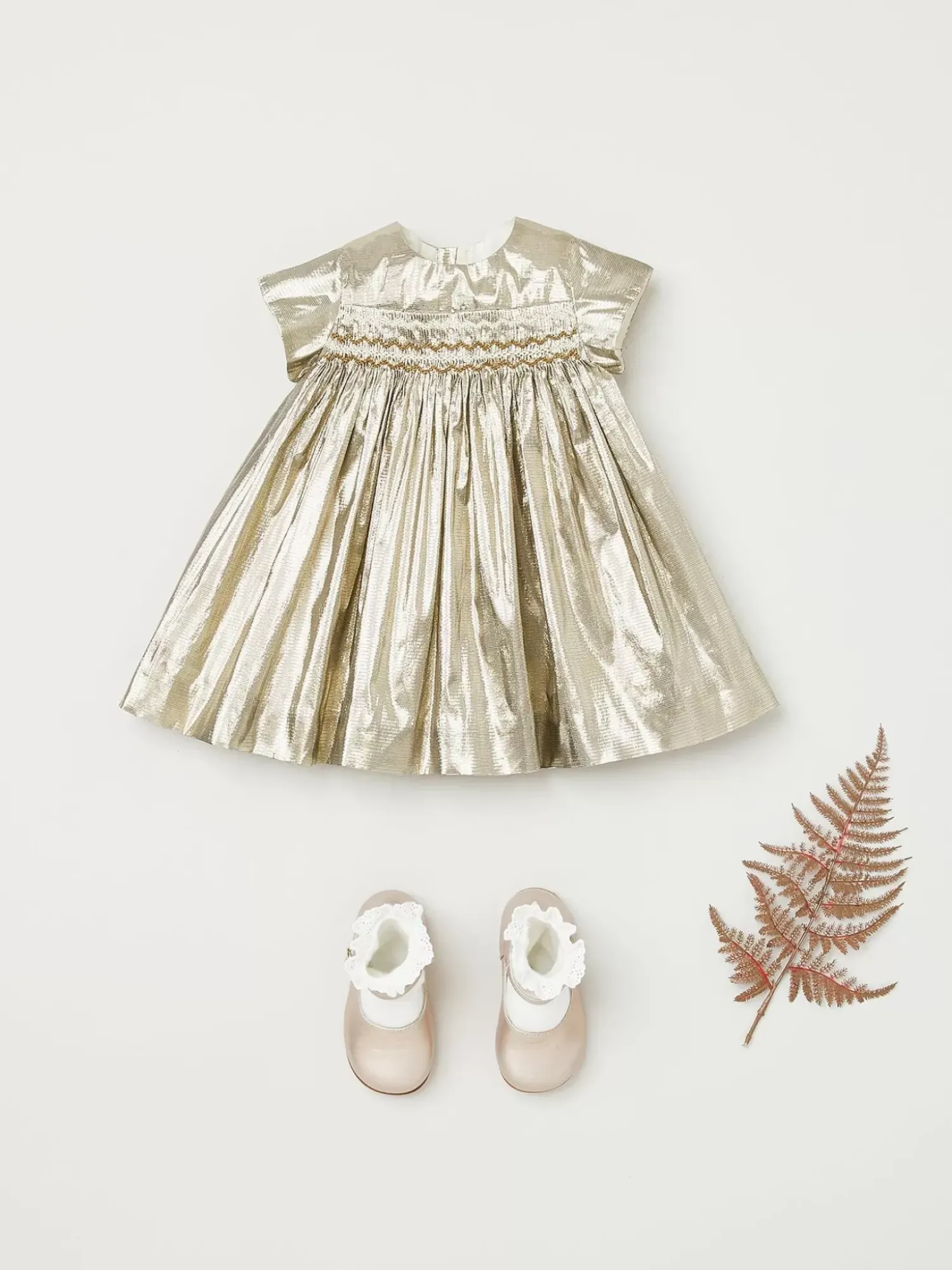 The Maruska Dress For Baby Has Eye-Catching Lamé Fabric Made From A Silk Blend. Matching Hand-Embroidered Smocking Decorates The Bodice And Sits Atop Gathering That Lends Movement To The Flared Cut.