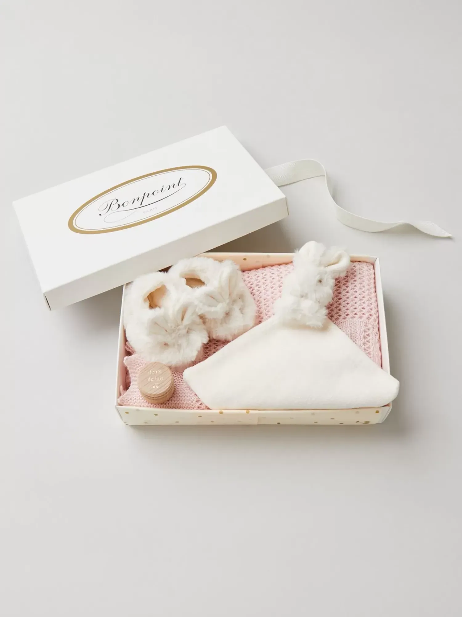 It Includes Our Iconic Cotton/Wool Blend Openwork Blanket In Light Pink, An Exclusive Bonpoint Velours Lovey With A Faux Fur Bunny Head, And An Adorable Pair Of Matching Booties. An Ideal Welcome Baby Gift.