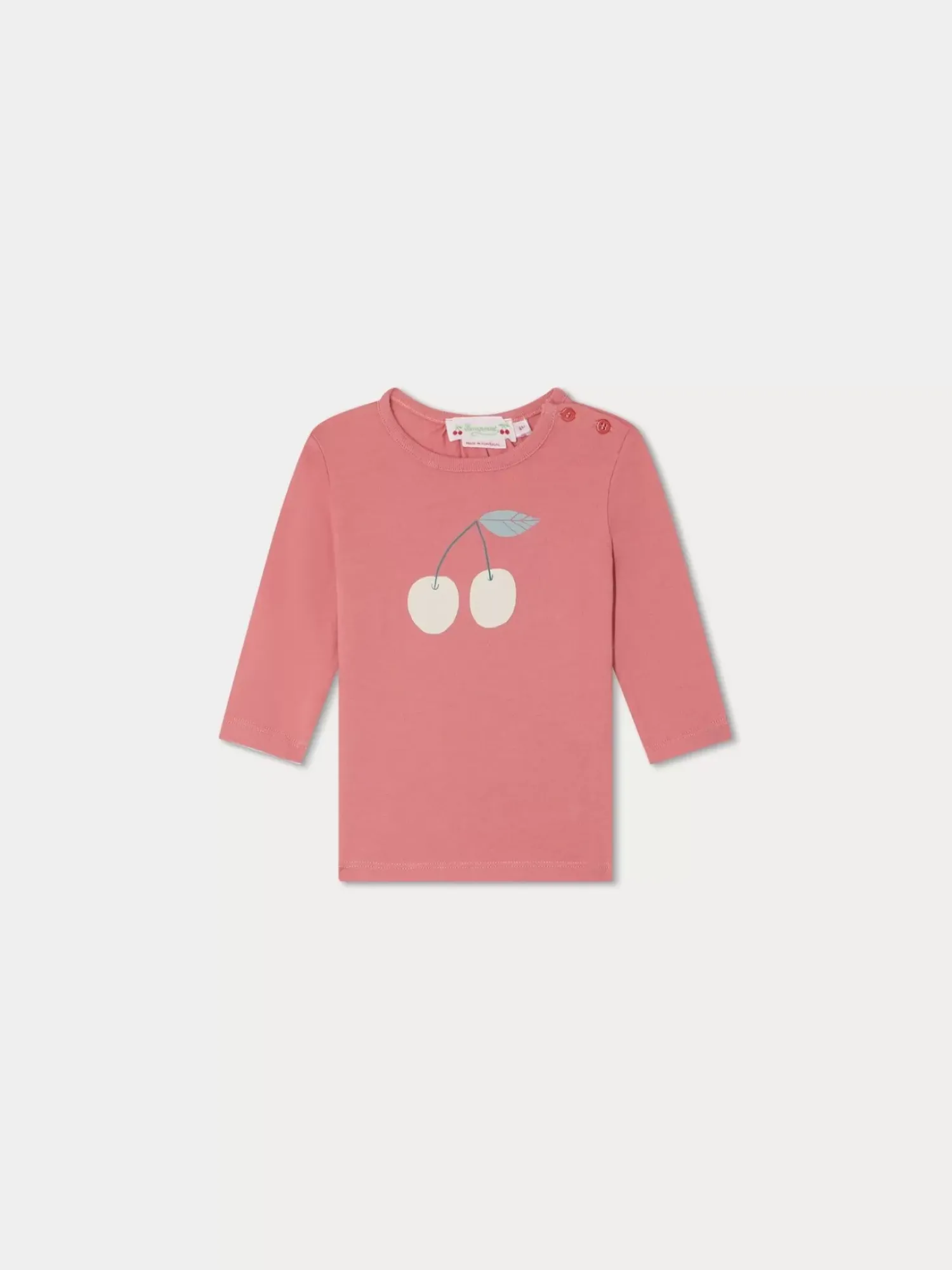 The Iconic Organic Cotton Tahsina T-Shirt For Babies Is Decorated On The Front With A Printed Cherry. This Garment Fastens At The Shoulder With Buttons And Has A Crew Neck, Long Straight Sleeves, And Small Pleats At The Back.