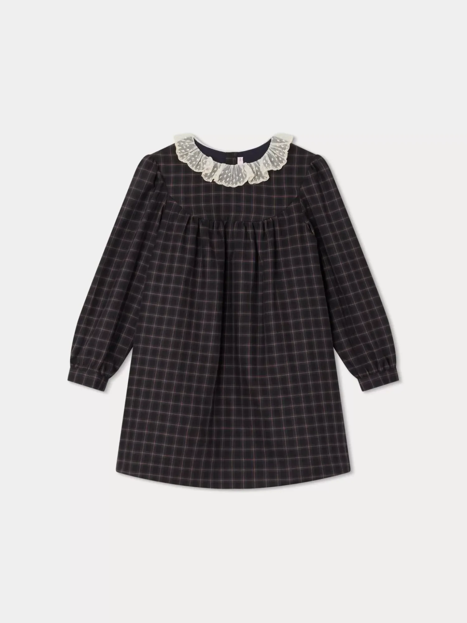 This Printed Tamiko Dress For Girls Is Loose-Fitting With A Buttoned Fastening At The Back. It Features A Scalloped, Swiss Dot Ruffled Collar, And Puffed Sleeves With Buttoned Cuffs. The Gathering Under The Rounded Yoke Adds A Finishing Touch.