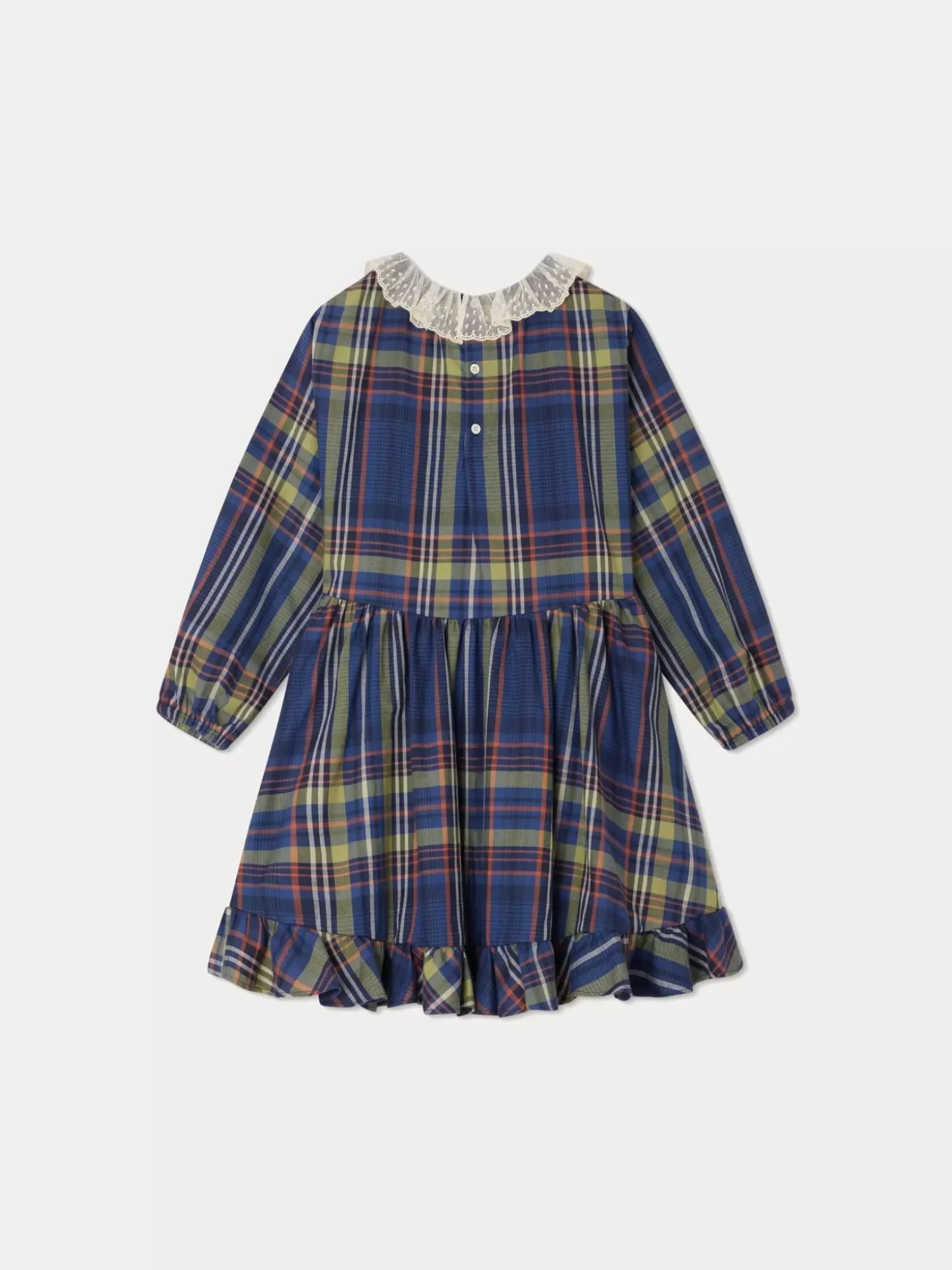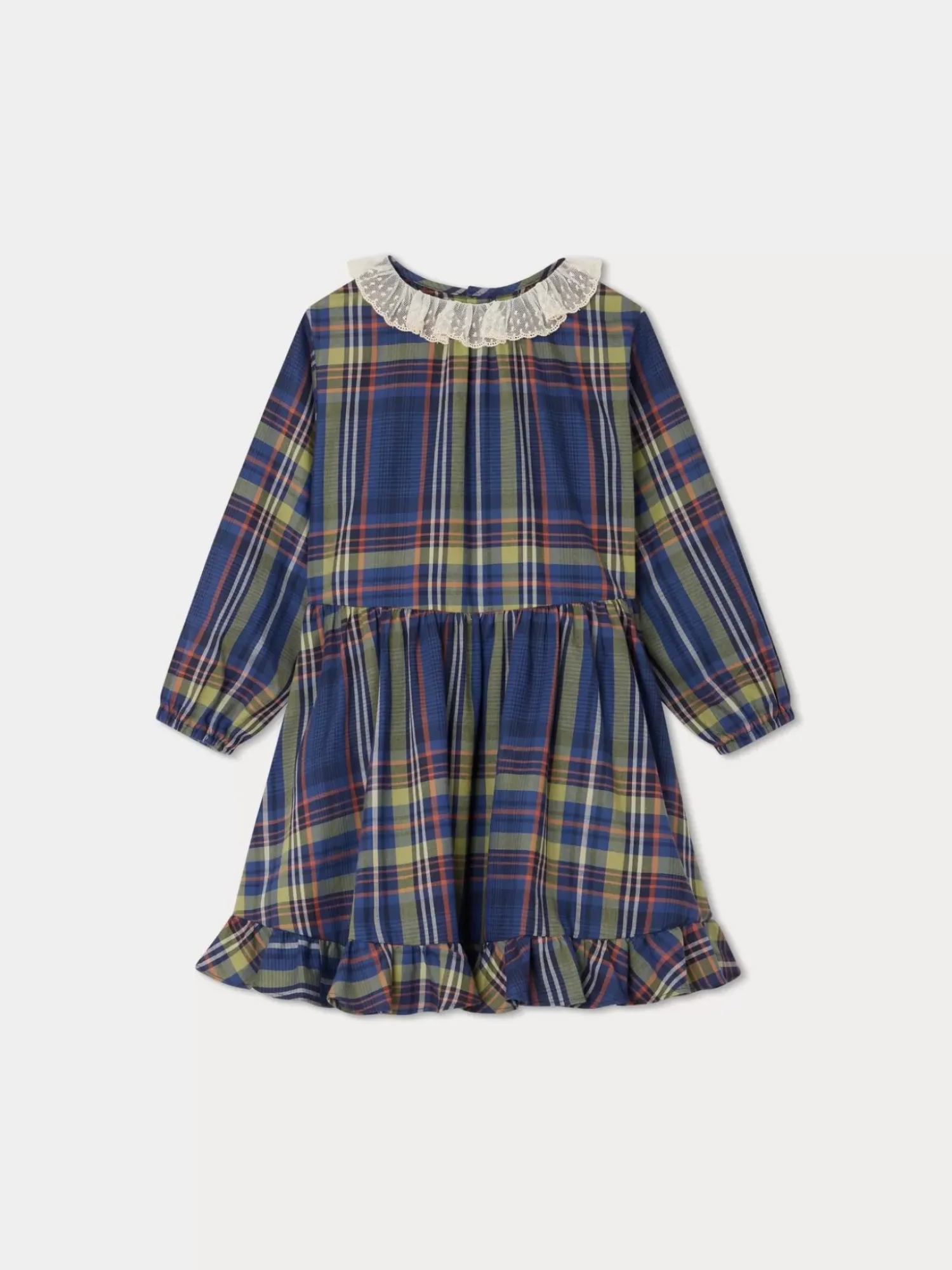 The Thays Dress For Girls Revisits Scottish Tartan With Its Flowing Twill Fabric That Is Particularly Pleasant To Wear. The Crew Neck Is Enhanced By A Delicate, See-Through Ruffled Collar With Swiss Dot Detailing.