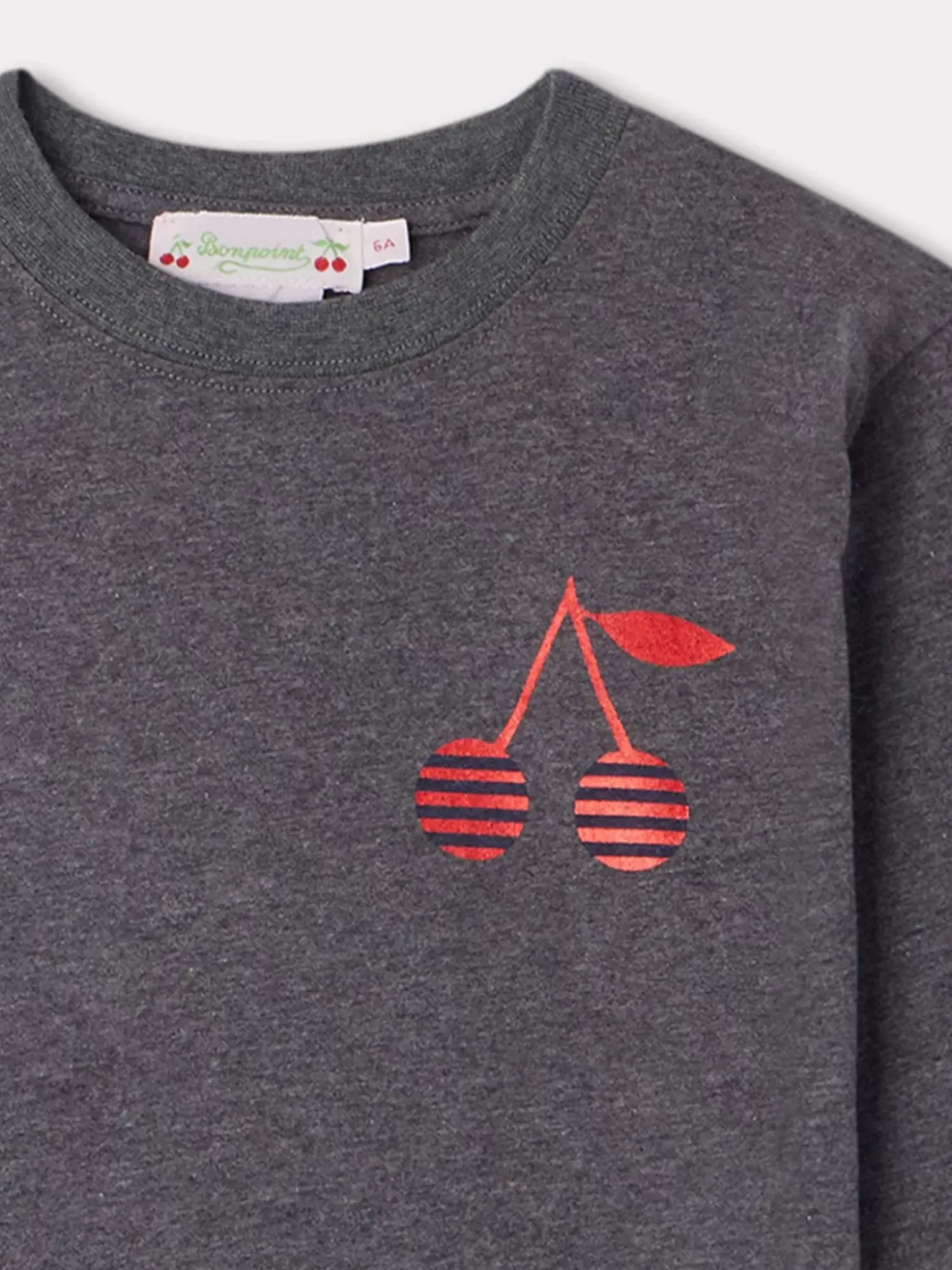 This Long-Sleeved Theia T-Shirt For Girls In Heathered, Certified Organic Cotton Is A House Must-Have This Season. The Chest Features An Iconic Bonpoint Cherry Decorated With Stripes.