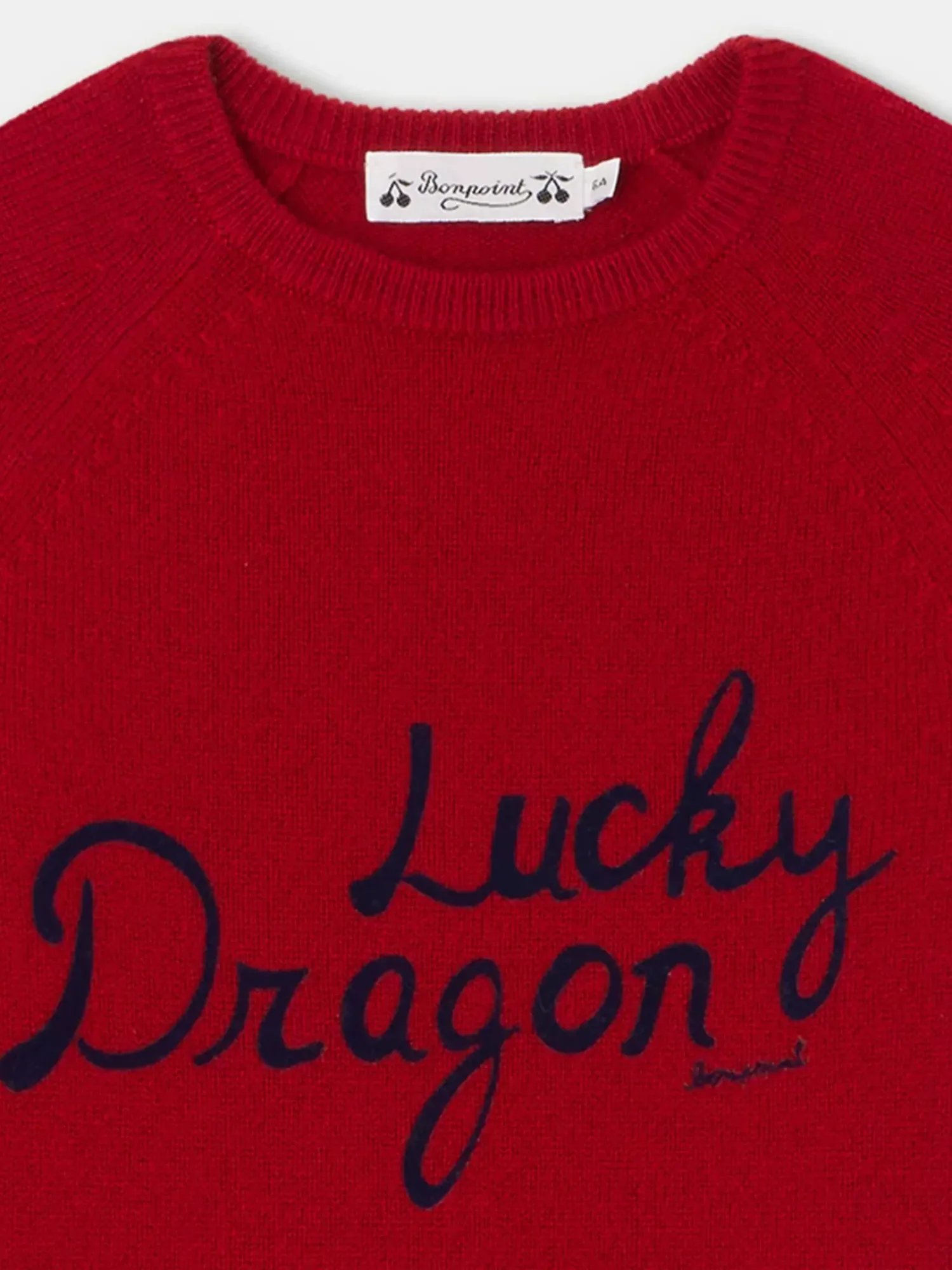 This Tiego Sweater For Boys Features A Distinctive “Lucky Dragon” Inscription In A Contrasting Knit On The Front. It Is Made From Cashmere From Certified Sources That Guarantee Animal Welfare.