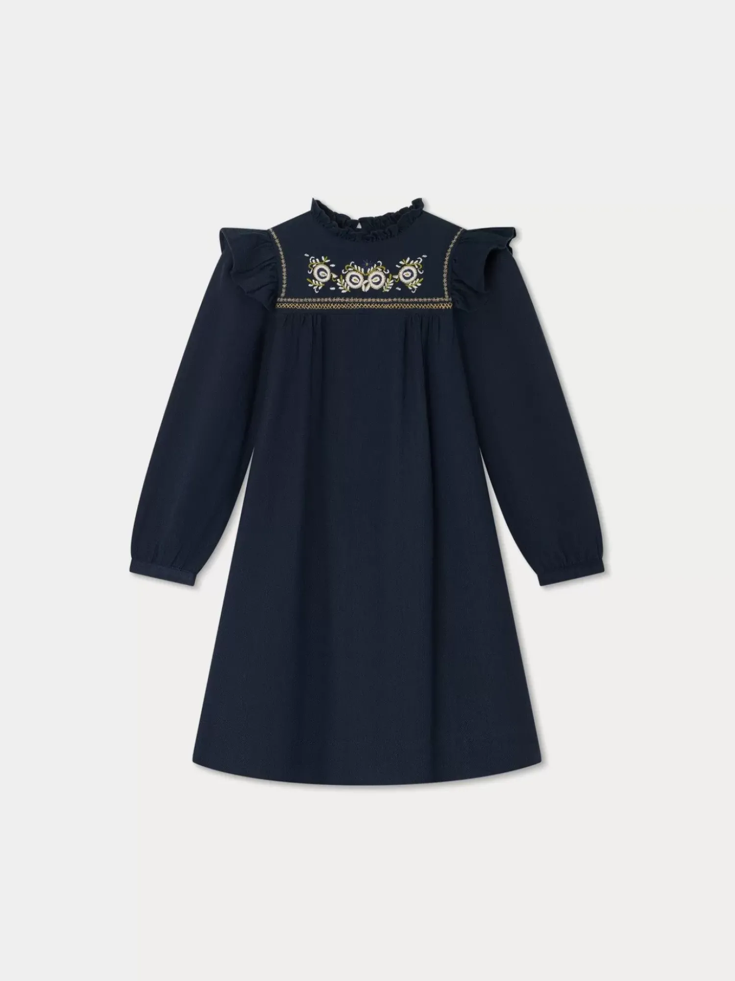 This Long-Sleeved Dress Is Made From Wool And Cotton And Is Decorated By A Gathered Neck, Ruffles At The Shoulder, And Gathers Below The Yoke. This Model Is Enhanced By Contrasting Embroidery At The Front.