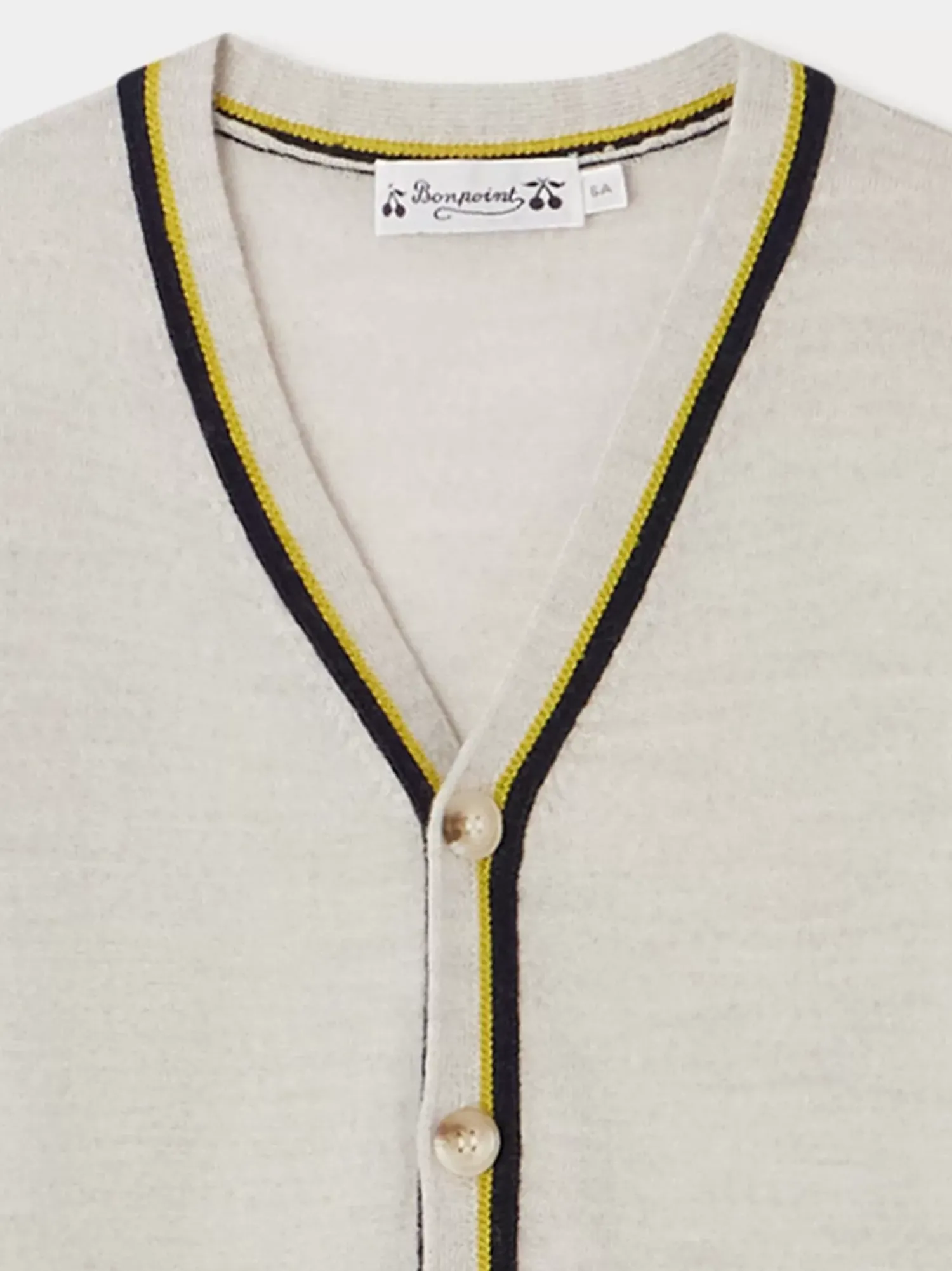 This Tilian Boys’ Cardigan Is Styled With A Very Elegant V Neck. It Also Features Distinctive Narrow Contrasting Stripes And An Embroidered Bonpoint Logo On The Front.